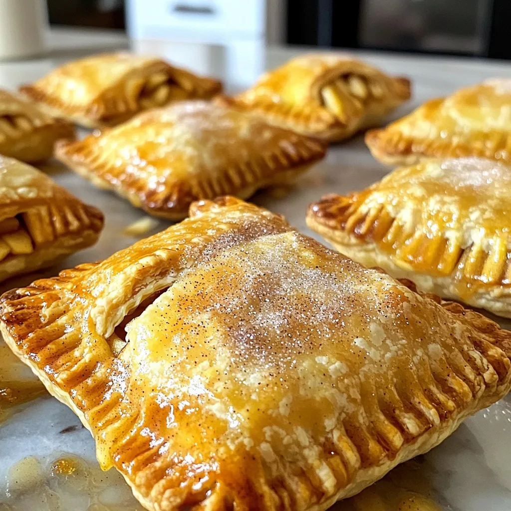 - 2 cups all-purpose flour - 1/2 teaspoon salt - 1/4 cup granulated sugar - 1/2 cup unsalted butter, chilled and cubed - 2 medium apples, peeled, cored, and diced For the crust, I use all-purpose flour. It gives a nice texture. The salt adds depth to the flavor. Granulated sugar sweetens the crust just right. The unsalted butter makes the dough rich and flaky. I like to chill the butter for the best results. Fresh apples are key for the filling. They bring sweetness and juiciness. - 1 teaspoon cinnamon - 1/4 teaspoon nutmeg - 1 tablespoon lemon juice - 1 egg (for egg wash) Cinnamon and nutmeg add warmth to the filling. I always use fresh spices for more flavor. Lemon juice brightens the apple taste. It cuts through the sweetness and keeps apples from browning. An egg wash gives the hand pies a beautiful golden color. - Additional granulated sugar for sprinkling - Icing or glaze variations For extra crunch and sweetness, I sprinkle more sugar on top. You can also add icing or a glaze if you like. This makes the hand pies look lovely and taste even better. To make the dough, start by mixing the dry ingredients. In a bowl, combine 2 cups of all-purpose flour, 1/2 teaspoon of salt, and 1/4 cup of granulated sugar. This mix gives a nice base for the dough. Next, add the butter into the dry mix. Use a pastry cutter or your fingers to blend in 1/2 cup of chilled and cubed butter. You want the mix to look like coarse crumbs. Then, slowly add cold water. Use a tablespoon and mix with a fork until the dough comes together. Don’t overmix! Wrap the dough in plastic wrap and chill it in the fridge for at least 30 minutes. This step helps the dough stay firm. Now onto the filling. Peel, core, and dice 2 medium apples. You want them in small pieces for good flavor in every bite. In a bowl, mix the diced apples with 1 teaspoon of cinnamon, 1/4 teaspoon of nutmeg, and 1 tablespoon of lemon juice. This mixture will give the filling a delicious sweet and spicy flavor. Set the apple filling aside while you prepare the dough. Once the dough is chilled, roll it out on a floured surface. Aim for about 1/8 inch thick. Use a round cutter or a glass to cut out circles, about 4-5 inches in diameter. Place a tablespoon of apple filling in the center of each circle. Fold the dough over to form a half-moon shape. Press the edges together to seal. For a fun touch, use a fork to crimp the edges. Preheat your air fryer to 350°F (175°C). Place a few hand pies in the basket, keeping space between them. Cook the hand pies for 10-12 minutes. You want them to be golden brown and crispy. After cooking, let the pies cool slightly before serving. Enjoy them warm or at room temperature for a tasty treat! - To make great dough, avoid overmixing. Mix until it just comes together. - Chill the dough for better texture. Wrap it in plastic and refrigerate for 30 minutes. - Use different types of apples for unique flavors. Granny Smith adds tartness, while Fuji gives sweetness. - Adjust sweetness with sugar. Start with a little, taste, and add more if needed. - Cook in batches to avoid overcrowding. This helps the pies cook evenly and get crispy. - Check for doneness by looking for a golden brown color. If it's not golden, give it a few more minutes. {{image_2}} You can switch up the filling in your hand pies for fun flavors. Berries make a great choice. You can use fresh strawberries, blueberries, or raspberries. Simply mash them with a bit of sugar and cornstarch. This makes a juicy berry filling. Another tasty option is pumpkin spice. For this, mix canned pumpkin with cinnamon, nutmeg, and a bit of sugar. This gives a warm, cozy taste perfect for fall. If you need gluten-free options, you can try almond flour or a gluten-free blend. These work well in the dough. Just remember to adjust the liquid, as gluten-free flours absorb differently. For vegan adjustments, replace the butter with coconut oil or vegan butter. You can use a flax egg instead of the egg wash. Mix one tablespoon of ground flaxseed with three tablespoons of water. Let it sit until it thickens, then brush it on the pies. To make your hand pies even tastier, consider adding vanilla extract to the apple filling. Just a splash can amplify the sweetness. You can also add nuts or raisins for extra texture. Chopped walnuts or pecans add crunch, while raisins bring sweetness. Mix these into your apple filling for a delightful twist. To store hand pies, first let them cool completely. Place them in an airtight container. You can keep them in the fridge for up to three days. If you want to store them longer, freezing is a great option. Wrap each pie in plastic wrap. Then put the wrapped pies in a freezer bag or container. They will stay fresh in the freezer for up to three months. For reheating, the air fryer works best. Preheat your air fryer to 350°F (175°C). Place the hand pies in the basket and heat for about 5 to 7 minutes. This will make them crispy again. If you don’t have an air fryer, you can use an oven. Preheat the oven to 350°F (175°C) and bake for about 10 minutes. In the fridge, hand pies last about three days if stored well. If you freeze them, they can last up to three months. Just remember to wrap them tightly to prevent freezer burn. Always check for any signs of spoilage before eating. Yes, you can make the dough ahead of time. To do this, follow the steps to mix the flour, salt, and sugar with the butter. Once you form the dough, wrap it in plastic. Store it in the fridge for up to two days. If you want to keep it longer, freeze the dough. Just remember to thaw it in the fridge overnight before you roll it out. For the best flavor, I recommend using tart apples. Varieties like Granny Smith or Honeycrisp work great. These apples hold their shape and add a nice balance of sweet and tart flavors. You can also mix in some sweeter apples for extra taste. Just ensure they are fresh and firm. To stop the filling from leaking, sealing the edges is key. Af