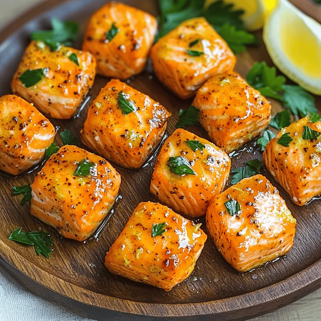 Serve the salmon bites with lemon wedges for an extra zing. Pair them with a fresh salad or steamed veggies for a light meal. You can also serve them on skewers as an appetizer for parties. Add a creamy dip, like garlic aioli, to enhance the flavor. Fresh parsley on top adds color and freshness.