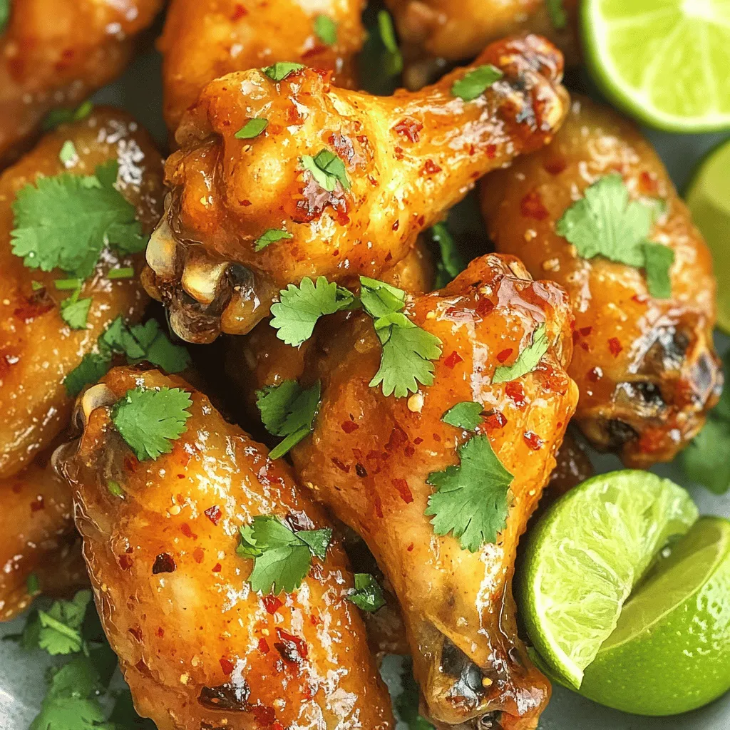 - 2 pounds chicken wings - 1/2 cup sweet chili sauce - 2 tablespoons soy sauce - 1 tablespoon garlic powder - 1 teaspoon smoked paprika - 1/2 teaspoon black pepper - 1/2 teaspoon salt - 1 tablespoon cornstarch - Fresh cilantro, chopped - Lime wedges - Patting the chicken wings dry: Start by using paper towels to pat the chicken wings dry. This removes extra moisture and helps them get crispy in the air fryer. - Marinate in sweet chili and soy sauce mixture: In a large bowl, mix sweet chili sauce, soy sauce, garlic powder, smoked paprika, black pepper, and salt. Add the dried wings to this mix. Make sure they are well coated. Cover the bowl and let it sit for at least 30 minutes. For even more flavor, let it marinate for up to 2 hours in the fridge. - Coating wings with cornstarch: After marinating, sprinkle cornstarch over the wings. Toss them to coat evenly. This helps create a crunchy texture when cooked. - Preheating air fryer to the right temperature: Set your air fryer to 400°F (200°C) and let it preheat. This step ensures the wings cook evenly. - Cooking time and flipping for even crispiness: Place the wings in a single layer in the air fryer basket. Cook them for 25-30 minutes. Halfway through, flip the wings to make sure they get crispy on all sides. Check that the internal temperature reaches 165°F (74°C) for safety. - Glazing the wings with extra sweet chili sauce: In the last 5 minutes of cooking, drizzle more sweet chili sauce over the wings. This gives them a sticky and flavorful glaze. - Serving with garnishes: Once cooked, take the wings out of the air fryer. Garnish them with chopped cilantro. Serve with lime wedges on the side for a fresh burst of flavor. To get crispy wings, start by drying them well. Moisture makes wings soggy. Use paper towels and pat them dry. This step is very important. Next, sprinkle cornstarch over the wings. Toss them to coat evenly. Cornstarch absorbs moisture and creates a crunchy crust. Marinating is key for tasty wings. I suggest marinating for at least 30 minutes. If you have time, let them sit for up to 2 hours. This longer time allows the flavors to sink in. You can boost the taste by adding lime juice or ginger to the marinade. Both add a zesty kick! Every air fryer is a bit different. If your model runs hot, check the wings early. You might need to adjust the cooking time. Cook in batches if you have a small air fryer. This ensures all wings cook evenly and get crispy. Don't crowd the basket; give them space to breathe! {{image_2}} You can change the flavor of your wings easily. For a spicy kick, add hot sauce to the marinade. Just mix it in with the sweet chili sauce. You will love the heat! For a fresh twist, use orange juice. This gives your wings a bright, citrus flavor. Just replace some of the sweet chili sauce with orange juice for a unique taste. If you don’t have an air fryer, you can bake the wings in the oven. Set your oven to 400°F (200°C). Spread the wings on a baking sheet and cook for 40-45 minutes. Flip them halfway for even crispiness. Grilling is another fun way to cook wings outdoors. Preheat your grill to medium-high heat and cook the wings for 25-30 minutes. Make sure to flip them to avoid burning. Not all sauces are created equal. If you need a gluten-free option, use gluten-free soy sauce. It works just as well in the marinade. You can also try other sauces. Teriyaki sauce or barbecue sauce can give your wings a different flavor. Just mix them in like you would with sweet chili sauce. To keep your air fryer sweet chili chicken wings fresh, cool them first. Let the wings sit at room temperature for no more than two hours. This helps keep bacteria away. Use airtight containers for storage. Glass or plastic containers work well. Make sure to label them with the date. This way, you know when to eat them. You can freeze chicken wings for future meals. After cooling, place the wings in freezer-safe bags. Remove as much air as possible to prevent freezer burn. Label the bags with the date. To thaw, put the wings in the fridge overnight. This keeps them safe and tasty. If you're in a hurry, you can use cold water. Just submerge the bag in cold water for about an hour. The best way to reheat wings is in the air fryer. Preheat it to 350°F (175°C). Place the wings in the basket and heat them for about 8-10 minutes. This keeps them crispy. If you don’t have an air fryer, you can use an oven. Set it to 350°F (175°C) and place the wings on a baking sheet. Heat them for 10-15 minutes. You can also use the microwave, but this may make the wings soft. Cook chicken wings in the air fryer for 25-30 minutes at 400°F (200°C). Flip the wings halfway through. This helps them cook evenly and get crispy. Make sure they reach an internal temperature of 165°F (74°C) before serving. Yes, you can use frozen chicken wings! Increase the cooking time to about 30-40 minutes. Cook them at the same temperature, 400°F (200°C). You should not need to thaw them first. Just be sure to check that they are fully cooked before serving. Sweet chili chicken wings pair well with many sides. Here are some great options: - Fresh vegetable sticks (like carrots and celery) - Creamy ranch or blue cheese dip - Crispy potato wedges - A side salad with tangy dressing - Steamed rice or quinoa These sides balance the sweet and spicy flavors of the wings. Enjoy them with lime wedges for an extra zing! You now have everything you need to make delicious sweet chili chicken wings. We discussed key ingredients, preparation steps, cooking methods, and helpful tips to achieve crispy perfection. You can also explore fun variations and proper storage for leftovers. Experiment with different flavors and cooking methods to find your favorite. Enjoy your tasty wings, and impress friends and family with your new skills!