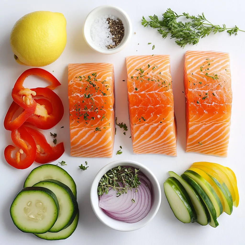 - 2 salmon fillets - 1 zucchini, sliced - 1 bell pepper, sliced - 1 small red onion, thinly sliced - 2 tablespoons olive oil - 2 cloves garlic, minced - Juice of 1 lemon - 1 teaspoon dried oregano - 1 teaspoon dried thyme - Salt and pepper to taste When making baked salmon foil packs, I love using fresh ingredients. The salmon fillets are the star of the show, providing rich flavor and healthy omega-3s. Zucchini, bell pepper, and red onion add color and crunch. The olive oil, garlic, and lemon juice make a tasty marinade that brings everything together. - Fresh parsley - Additional lemon slices For a finishing touch, I like to add fresh parsley. It adds a nice pop of color and flavor. Extra lemon slices can brighten each bite. You can use these garnishes to make your meal look even more appealing. {{ingredient_image_1}} - Preheat the oven to 375°F (190°C). - Cut two large pieces of aluminum foil, each about 12 inches long. First, you need to preheat your oven. This step helps cook the salmon evenly. While the oven heats, grab some aluminum foil. Cut two sheets, each about 12 inches long. This size will hold the salmon and veggies well. - Mixing the marinade - Assembling the foil packs - Baking time and temperature Now, let’s make a tasty marinade. In a small bowl, mix 2 tablespoons of olive oil, 2 minced garlic cloves, and the juice of 1 lemon. Add 1 teaspoon of dried oregano and 1 teaspoon of dried thyme. Don’t forget to add salt and pepper to taste. This mix adds great flavor! Next, it’s time to build the foil packs. Place one salmon fillet in the center of each foil piece. Surround the salmon with sliced zucchini, bell pepper, and red onion. Make sure to divide the veggies evenly between the two packs. Drizzle the olive oil mixture over everything. Fold the sides of the foil over the salmon and veggies. Seal the packets tightly to keep the steam inside. This helps cook the salmon perfectly. Place the foil packs on a baking sheet and put them in the oven. Bake for 20-25 minutes until the salmon flakes easily with a fork. - Tips for testing if salmon is cooked To check if your salmon is done, look for a few signs. The fish should be opaque and flake easily with a fork. If it's still pink in the center, give it a few more minutes. Use a fork to test gently. Your meal will be perfect when it’s fully cooked! For foil packs, the best types of salmon are wild-caught or farmed Atlantic salmon. They have a nice flavor and cook well in foil. Look for fillets that are bright in color and firm to touch. The skin should be shiny, and there shouldn’t be any strong fishy smell. To boost flavor, try marinating your salmon for at least 30 minutes. A mix of olive oil, lemon juice, garlic, and herbs is perfect. You can also add ingredients like cherry tomatoes or asparagus for extra taste. Fresh herbs like dill or basil add a nice touch too. When sealing your foil packs, fold the edges tightly to keep steam inside. This helps the salmon cook evenly. If your fillets are thicker, increase the cooking time by about 5 minutes. Always check for doneness. Salmon should flake easily with a fork when it’s done. Pro Tips Choose Fresh Salmon: Opt for wild-caught salmon if possible, as it has a richer flavor and better texture compared to farmed varieties. Customize Vegetables: Feel free to swap in your favorite vegetables like asparagus or cherry tomatoes for a personal touch and different flavors. Seal Tightly: Make sure to seal the foil packs tightly to keep the steam in, which helps cook the salmon evenly and keeps it moist. Rest Before Serving: Allow the foil packs to rest for a few minutes after baking; this helps the flavors meld together and makes for a juicier dish. {{image_2}} You can swap out the zucchini, bell pepper, and red onion for other veggies. Here are some tasty options: - Asparagus - Cherry tomatoes - Broccoli florets - Carrots, sliced - Green beans Mix and match these veggies to fit your taste. Each option adds a unique flavor and texture. To change up the taste, try different marinades and seasonings. Here are some ideas: - Teriyaki sauce for an Asian twist - Cajun seasoning for a spicy kick - Honey and mustard for a sweet touch - Lemon dill for a fresh flavor You can also add fresh herbs like basil or cilantro for extra zest. Feel free to use different proteins instead of salmon. Here are some great swaps: - Chicken breast for a lean option - Shrimp for a quick-cooking seafood choice - Tofu for a plant-based meal Adjust the cooking time based on your protein choice. Chicken and shrimp may need a bit longer, while tofu cooks faster. To store cooked salmon foil packs, let them cool first. Place them in airtight containers. You can also wrap them tightly in plastic wrap. Store the packs in the fridge for up to three days. Make sure to keep the veggies with the salmon to maintain flavor. When reheating, use the oven for best results. Preheat your oven to 350°F (175°C). Place the foil packs on a baking sheet. Warm them for about 10-15 minutes. This keeps the fish moist and tasty. You can also use a microwave. If you choose this method, place the salmon on a microwave-safe plate. Heat in short bursts of 30 seconds, checking often. This way, you avoid drying out the fish. You should bake salmon in foil for 20-25 minutes at 375°F (190°C). The baking time depends on the thickness of the salmon. If your fillets are thicker, you may need to add a few extra minutes. A good rule is to check for doneness when the salmon flakes easily with a fork. Yes, you can use parchment paper if you prefer. However, foil is better for sealing in steam. Parchment allows some steam to escape, which may affect cooking time. If you use parchment, ensure you fold the edges tightly to keep the moisture in. Baked salmon foil packs pair well with many sides. Here are some ideas: - Fluffy rice or quinoa - Steamed broccoli or green beans - A fresh garden salad - Roasted potatoes for a hearty touch These sides 