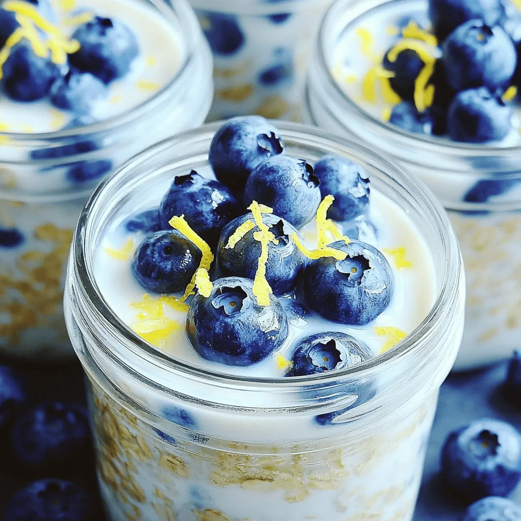 Divide the oat mix into two mason jars or airtight containers. Seal them tightly to keep the flavors fresh. Place the jars in the fridge overnight. If you’re short on time, let them soak for at least 4 hours. This step allows the oats to absorb the liquid and flavors. In the morning, stir the oats well. If they feel too thick, add a splash of milk to reach your desired consistency. Top with the reserved blueberries and extra lemon zest before enjoying.