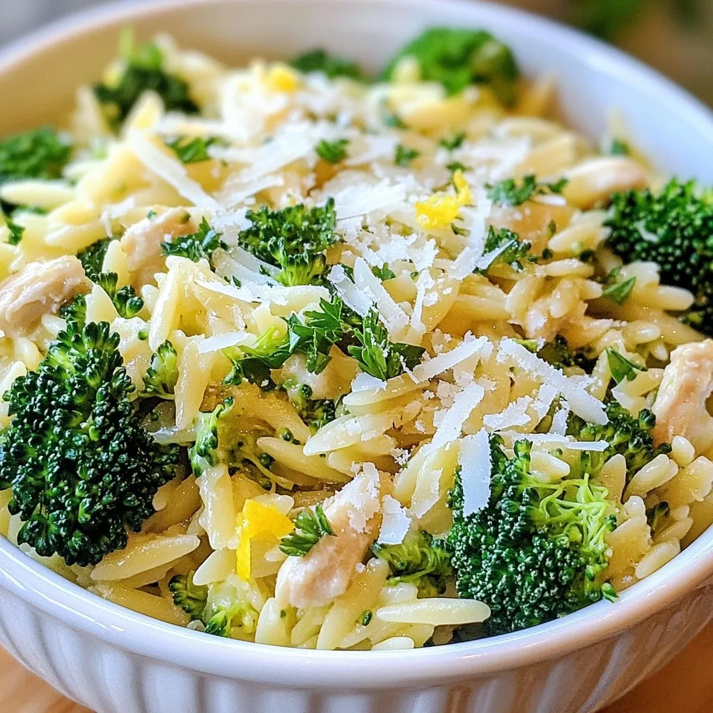 For a tasty Chicken and Broccoli Orzo, gather these key ingredients: - 1 cup orzo pasta - 2 tablespoons olive oil - 2 boneless, skinless chicken breasts, diced - 2 cups broccoli florets - 4 cloves garlic, minced - 1 lemon (zested and juiced) - 1 teaspoon dried oregano - 1 teaspoon paprika - Salt and pepper to taste - 1/2 cup grated Parmesan cheese - Fresh parsley for garnish These ingredients blend perfectly, giving you a hearty meal. The orzo pasta acts as the base. It absorbs all the great flavors. Chicken adds protein, while broccoli brings crunch and color. Garlic adds a nice aroma and zest. You can add more ingredients for extra taste. Here are a few suggestions: - Cherry tomatoes for sweetness - Spinach for added greens - Red pepper flakes for heat - Sun-dried tomatoes for a savory touch These add-ins can give your dish a unique twist. You can mix and match based on what you like. To make this dish smoothly, you will need: - A large pot for cooking orzo - A large skillet for sautéing - A wooden spoon for mixing - A knife and cutting board for chopping Having the right tools makes cooking easier. Make sure to have these on hand before you start. {{ingredient_image_1}} To cook the orzo, first, bring a large pot of salted water to a boil. Add 1 cup of orzo pasta to the pot. Stir it gently to prevent sticking. Cook according to the package instructions until it’s al dente, which means firm but cooked through. This usually takes about 8-10 minutes. Once done, drain the orzo and set it aside. This step is key for a perfect texture. Now it's time to sauté the chicken. In a large skillet, heat 2 tablespoons of olive oil over medium heat. When the oil is hot, add 2 diced boneless, skinless chicken breasts. Season the chicken with salt, pepper, 1 teaspoon of dried oregano, and 1 teaspoon of paprika. Cook for about 5-7 minutes. You want the chicken to turn golden brown and be cooked through. This gives a nice flavor to the dish. Next, let's add some color and flavor. Add 2 cups of broccoli florets to the skillet with the chicken. Then, toss in 4 minced garlic cloves. Stir everything together and cook for another 3-4 minutes. You want the broccoli to be tender but still bright green. This keeps it crunchy and fresh, adding a great texture to your dish. To make juicy chicken, start with good-quality chicken breasts. Cut them into even pieces. This helps them cook evenly. Heat olive oil in your skillet until it's hot. Season the chicken well with salt, pepper, oregano, and paprika before adding it to the pan. Sauté the chicken until golden brown, about 5-7 minutes. This browning adds flavor. Let the chicken rest after cooking. This keeps it juicy. For tender broccoli, you want to cook it just right. Add the broccoli florets to the skillet with the chicken. Cook for 3-4 minutes. You want the broccoli to be bright green and tender but still crisp. If you overcook it, it gets mushy. A quick stir-fry keeps its color and flavor. Cheese adds a wonderful flavor to Chicken and Broccoli Orzo. I recommend using grated Parmesan cheese. It melts well and adds a nice salty taste. Sprinkle it on after cooking. For extra creaminess, you might try adding a bit of mozzarella or ricotta. Mix it into the warm pasta for a rich finish. Pro Tips Cooking Orzo Perfectly: Make sure to salt your water generously when cooking orzo. This enhances the flavor of the pasta. Chicken Browning: For the best flavor, let the chicken sit undisturbed for a couple of minutes before stirring. This helps achieve a nice golden-brown crust. Fresh Broccoli Tips: To keep broccoli vibrant and crunchy, avoid overcooking. It should be bright green and tender but still have a slight crisp. Lemon Zest Usage: Use a microplane to zest the lemon. This will give you fine zest without the bitter white pith, enhancing the overall flavor of the dish. {{image_2}} You can easily make a vegetarian version of this dish. Swap out the chicken for chickpeas or tofu. These options give protein and texture. Use vegetable broth instead of chicken broth for cooking the orzo. This keeps the flavor rich. You can also add more veggies like bell peppers or carrots. These add color and crunch. Don't forget to add extra spices to boost the flavor. If you need a gluten-free version, try using rice or quinoa. Both options work well as substitutes. Cook them just like orzo in salted water. There are also gluten-free orzo pasta options available. Check the store for these. They taste great and fit into the dish easily. Always read labels to ensure they meet your needs. You can change the flavors with different spices and herbs. For a kick, add red pepper flakes. They give heat and excitement. Fresh herbs like basil or thyme can brighten the dish. Try adding a bit of cumin for warmth. Lemon juice also brings brightness and freshness. Feel free to experiment and find your perfect blend. To keep your Chicken and Broccoli Orzo fresh, store it in an airtight container. Let it cool to room temperature first. This helps to prevent moisture build-up. Place the container in the fridge. Your leftovers will stay good for up to three days. When you're ready to enjoy your leftovers, reheat them gently. Use a skillet over low heat for best results. Add a splash of water or broth to keep it moist. Stir often to prevent sticking. If you prefer, you can use the microwave. Heat in short bursts, stirring in between. You can also freeze Chicken and Broccoli Orzo. Place it in a freezer-safe container. It can last for up to three months in the freezer. When you want to eat it, thaw it overnight in the fridge. Reheat as mentioned before for the best taste. To make Chicken and Broccoli Orzo in one pot, start by cooking the orzo in salted water. Once cooked, drain and set aside. In the same pot, heat olive oil over medium heat. Add diced chicken, season with salt, pepper, oregano, and paprika. Cook until the chicken is golden and cooked through, about 5-7 minutes. Next, add broccoli florets 