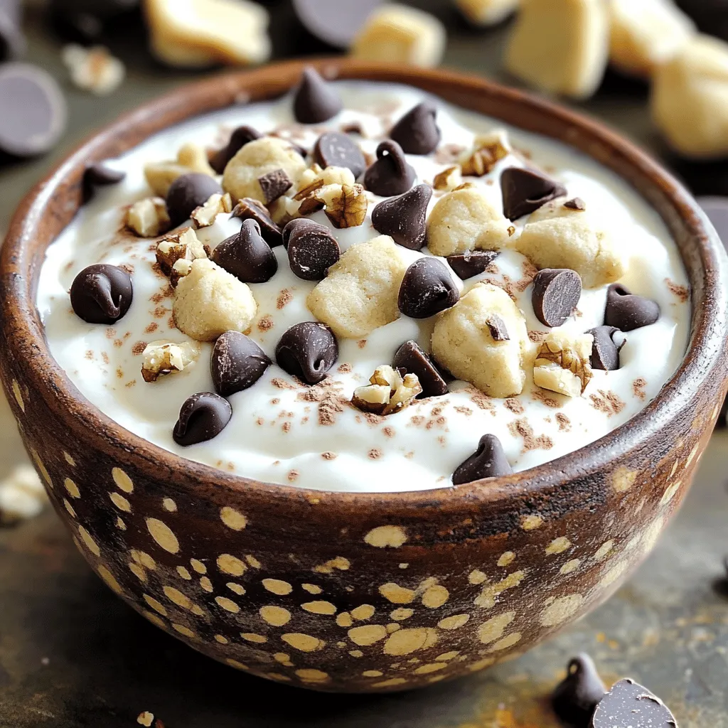 - 2 cups plain Greek yogurt - 1/4 cup almond flour - 1/4 cup brown sugar or coconut sugar - 2 tablespoons maple syrup - 1 teaspoon vanilla extract - 1/4 teaspoon salt - 1/2 cup mini chocolate chips - 1/4 cup walnuts, chopped (optional) - Additional chocolate chips or cookie dough pieces for topping (optional) To make Chocolate Chip Cookie Dough Greek Yogurt, gather these simple ingredients. Each one adds flavor and texture. The Greek yogurt gives a creamy base. Almond flour brings a nice nutty taste. Brown sugar or coconut sugar adds sweetness. Maple syrup enhances the flavor, while vanilla extract gives depth. A touch of salt balances the sweet notes. Mini chocolate chips create that cookie dough feel. If you like, add chopped walnuts for crunch. For a fun finish, top with more chocolate chips or cookie dough pieces. These ingredients not only taste great but also blend well together. They make a light and tasty treat. You can adjust the sweetness to your liking. Feel free to experiment with the toppings too. Enjoy making your own version! - First, grab a large mixing bowl. Add 2 cups of plain Greek yogurt. - Next, mix in 1/4 cup almond flour and 1/4 cup brown sugar or coconut sugar. - Pour in 2 tablespoons of maple syrup, 1 teaspoon of vanilla extract, and 1/4 teaspoon of salt. - Now, use a whisk to mix until the mixture is smooth and creamy. - Make sure there are no lumps from the almond flour or sugar. - Gently fold in 1/2 cup mini chocolate chips and 1/4 cup chopped walnuts if you want. - After mixing, transfer the Greek yogurt mixture into serving bowls. - Chill the bowls in the refrigerator for at least 30 minutes. - Chilling helps the flavors blend and makes the treat extra tasty. - Serve it cold for the best experience! To make your Chocolate Chip Cookie Dough Greek Yogurt super smooth, whisk it well. Use a large bowl and a sturdy whisk. Start with the yogurt, almond flour, and sugar. Mix these together first. It helps to break down any lumps. Whisk until it looks creamy and well-blended. If you see lumps, keep whisking! This step is key for a great texture. After mixing, taste your yogurt. If it needs more sweetness, add more maple syrup or brown sugar. A little goes a long way. You can also try using honey or agave syrup for different flavors. Just remember, start small and add more as needed. You want it to taste just right for you. When serving, think about toppings! Add extra chocolate chips or small cookie dough pieces on top. This makes it look fancy and fun. You can also serve it in cute bowls or jars. For gatherings, consider pairing it with fresh fruits or granola. This adds color and crunch. Your guests will love it! {{image_2}} You can make this treat healthier in easy ways. First, use non-dairy yogurt. Almond or coconut yogurt works well. This swap keeps the taste while cutting dairy. Next, reduce the sugar. You can cut the brown sugar in half. Try using a sugar substitute like stevia or monk fruit for a lighter version. This change still gives sweetness without the extra calories. Get creative with mix-ins! You can add dried fruits like raisins or cranberries. Nuts also add crunch and flavor. Try walnuts, pecans, or almonds for a nutty twist. You can also explore flavor variations. Add a spoonful of peanut butter for a rich taste. Or, try seasonal spices like cinnamon or pumpkin spice during the fall. These options keep your yogurt fun and fresh. Pair your Greek yogurt with fresh fruits like berries or banana slices. This adds color and flavor. Another fun idea is to make a parfait. Layer your yogurt with granola and fruits in a glass. This not only looks pretty but also makes a great breakfast or snack. Enjoy your delicious creations! To store leftover Chocolate Chip Cookie Dough Greek Yogurt, keep it in an airtight container. This helps it stay fresh and tasty. You can enjoy it for up to 5 days in the fridge. Make sure to scoop out what you need without touching the rest to keep it safe. If you want to save some for later, freezing is a great option. Divide the mixture into small portions and place them in freezer-safe containers. You can freeze the yogurt for up to 3 months. When you’re ready to enjoy it, take a portion out and place it in the fridge. Let it thaw overnight for the best texture. Avoid microwaving it, as that can change how it feels and tastes. You can use oat flour or all-purpose flour. Both work well in recipes. Oat flour adds a nice texture. All-purpose flour keeps it simple. To make it vegan, swap Greek yogurt for a plant-based yogurt. Use maple syrup instead of brown sugar. Ensure your chocolate chips are dairy-free. These changes keep the same yumminess. Yes, you can use regular yogurt. It will make the dish thinner. You might need to adjust the almond flour to keep it thick. Serve it in small bowls or cups. Top it with extra chocolate chips or cookie dough pieces. Enjoy it cold for the best flavor. Yes, this recipe is kid-friendly. To make it safe for nut allergies, skip the walnuts. This treat is fun and safe for kids to enjoy! This blog post covered a delicious Greek yogurt dessert. We explored the key ingredients, simple steps, and helpful tips. You learned how to achieve the perfect creaminess and adjust sweetness. Variations and serving suggestions offered fresh ideas for your dessert. In conclusion, this recipe is easy to customize and share. Create it for fun gatherings or as a tasty treat. Enjoy making this dish for family and friends. It’s sure to impress!