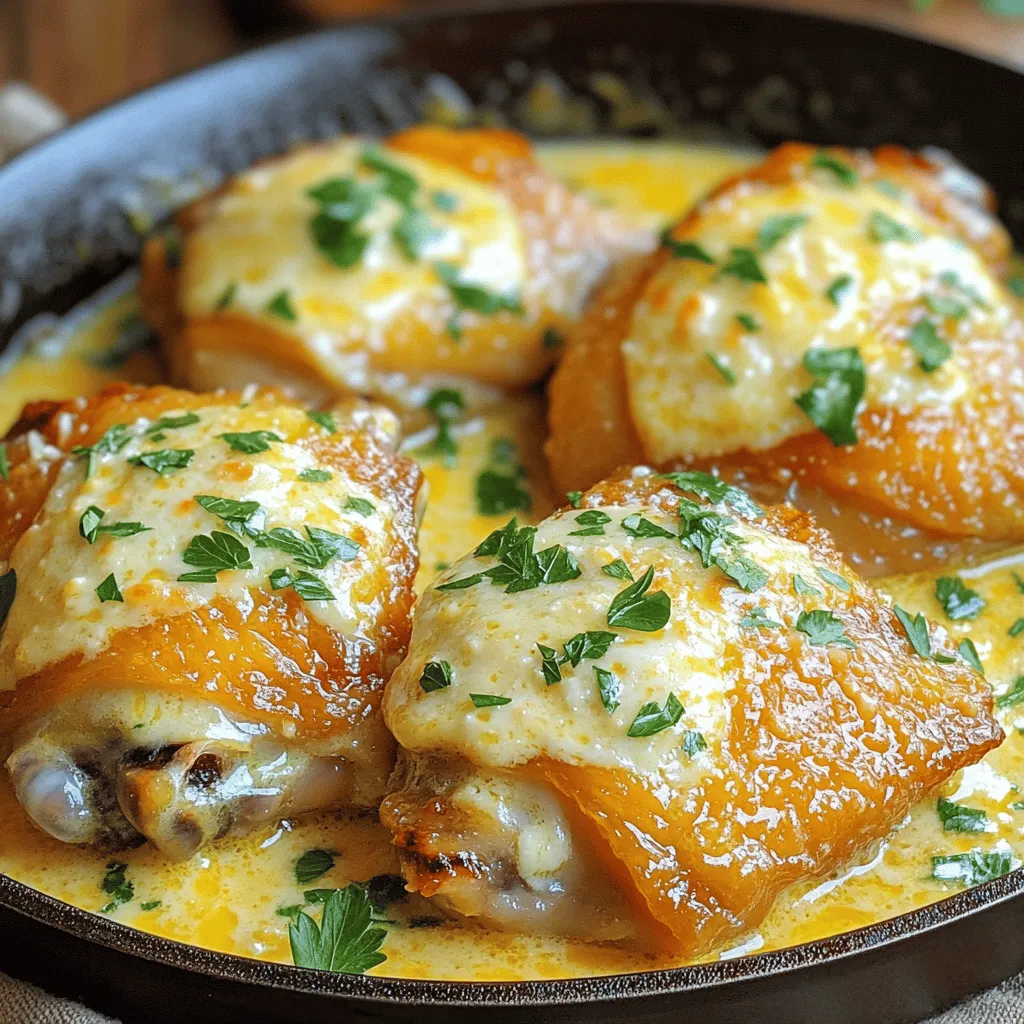 Return the chicken thighs to the skillet. Spoon some of that creamy sauce over them. Now, transfer the skillet to the oven. Bake for 25-30 minutes. Check that the chicken reaches an internal temperature of 165°F (75°C). The sauce should be bubbly when ready. After baking, let it rest for a few minutes. Finally, garnish with fresh parsley before serving. Enjoy your meal!