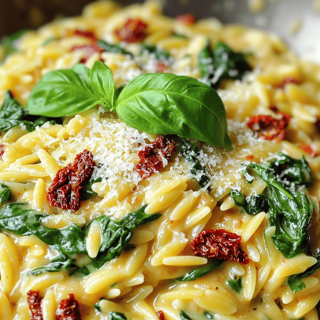 These ingredients create a rich, creamy dish that is full of flavor. The orzo pasta serves as a great base. It cooks quickly and absorbs the broth beautifully. Sun-dried tomatoes add a burst of tanginess, while fresh spinach offers a nice pop of color and nutrition.