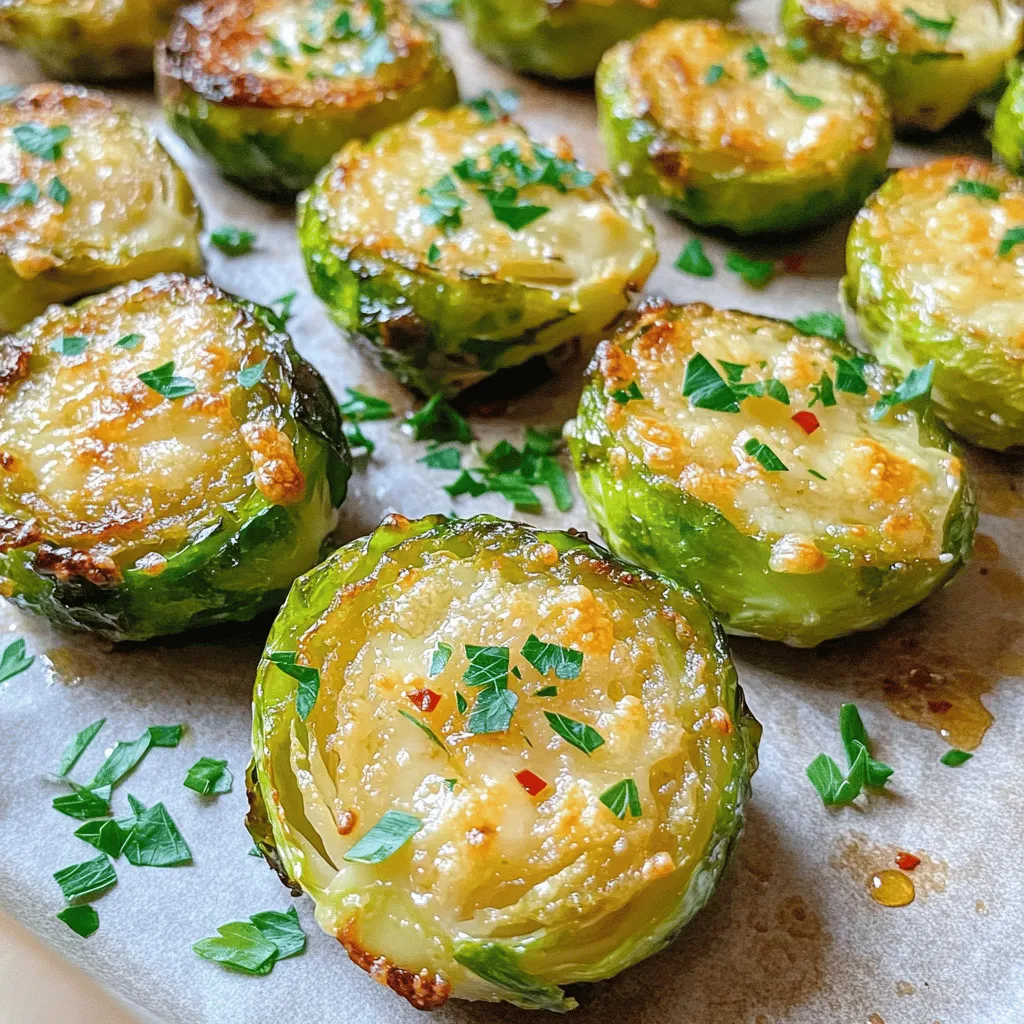 To make these delightful Brussels sprouts, gather these key ingredients: - 1 lb Brussels sprouts, trimmed and halved - 4 cloves garlic, minced - 1/4 cup grated Parmesan cheese - 3 tablespoons olive oil - 1 teaspoon balsamic vinegar - 1/2 teaspoon salt - 1/4 teaspoon black pepper These ingredients create a savory blend that enhances the taste of Brussels sprouts. If you want to kick up the taste, consider adding: - 1/4 teaspoon red pepper flakes (for a spicy kick) - Fresh parsley, finely chopped (for garnish) These optional ingredients add depth and color to your dish. When picking Brussels sprouts, look for firm, bright green ones. Avoid any that feel soft or have yellow leaves. Smaller sprouts often taste sweeter. You can also check for freshness by looking at the stem. It should be moist, not dried out. Fresh sprouts will elevate your dish and make it even more enjoyable. First, set your oven to 425°F (220°C). This high heat helps the Brussels sprouts get crispy. While the oven warms, line a baking sheet with parchment paper. This makes cleanup easy and helps prevent sticking. Grab a large bowl and add 1 lb of halved Brussels sprouts. Next, add 4 minced garlic cloves, 3 tablespoons of olive oil, and 1 teaspoon of balsamic vinegar. Sprinkle in 1/2 teaspoon of salt, 1/4 teaspoon of black pepper, and optional red pepper flakes for heat. Toss everything well. Make sure all the Brussels sprouts get a nice coating. Spread the coated Brussels sprouts in a single layer on your baking sheet. Avoid crowding them. This ensures they roast well. Place the sheet in the oven and roast for 20-25 minutes. Stir halfway through to help them brown evenly. After that, take them out and sprinkle 1/4 cup of grated Parmesan cheese on top. Put them back in the oven for 5 more minutes. The cheese will melt and become golden. Enjoy your Garlic Parmesan Roasted Brussels sprouts! To get that sweet, crispy look, space your Brussels sprouts well. Overcrowding makes them steam, not roast. Make sure they sit in a single layer on the baking sheet. Use high heat, around 425°F (220°C). This helps them brown and caramelize. Stir them halfway through cooking for even browning. You want the outer leaves to crisp up and turn golden. Taste is personal, and you can change the seasonings. Start with salt and black pepper, but feel free to add more. If you love heat, the red pepper flakes are a great choice. You can also mix in some garlic powder for extra garlic flavor. A squeeze of lemon juice after roasting adds a nice zing. Leftover Brussels sprouts can shine in many meals. Chop them up and toss them in a salad. They also work well in stir-fries or frittatas. Mix with pasta for a quick dish. You can even blend them into a soup for added nutrition. Don’t let them go to waste; they are so versatile! {{image_2}} You can switch the Parmesan for different cheeses. Try using Pecorino Romano for a sharper taste. Feta adds a creamy and tangy twist. If you love blue cheese, crumble it on top for bold flavor. Each cheese brings a new character to the dish. Experiment to find your favorite! To make this dish vegan, swap the Parmesan for nutritional yeast. Nutritional yeast gives a cheesy taste without dairy. You can also use vegan cheese shreds if you prefer. The garlic and spices will still shine through. Enjoy the same delicious flavors while keeping it plant-based! You can mix Brussels sprouts with other veggies. Carrots, sweet potatoes, or bell peppers work great. Just cut them to similar sizes for even cooking. Toss them with the same oil and spices. This adds color and flavor to your meal. A roasted medley keeps things exciting on your plate! After you enjoy your Garlic Parmesan Roasted Brussels Sprouts, store any leftovers in the fridge. Use an airtight container to keep them fresh. They can last for about 3 to 4 days. When you store them, ensure they cool down first. This helps keep their taste and texture. To reheat your Brussels sprouts, use the oven for the best results. Preheat the oven to 350°F (175°C). Spread the sprouts on a baking sheet. Heat them for about 10 to 15 minutes until warm. This method helps them stay crispy. You can also use a microwave, but they may get a bit soft. You can freeze Garlic Parmesan Brussels Sprouts if you want to save them for later. First, let them cool completely. Then, spread them in a single layer on a baking sheet. Freeze for about 1 hour. After that, transfer them to a freezer bag or container. They will last for up to 3 months. When ready to eat, thaw in the fridge overnight and reheat in the oven for that crispy texture again. Yes, you can prepare Garlic Parmesan Roasted Brussels Sprouts ahead of time. Cook them fully, then let them cool. Store them in an airtight container in the fridge for up to three days. When you are ready to serve, reheat them in the oven at 350°F (175°C) for about 10-15 minutes. This keeps them warm and crispy. If you need a substitute for Parmesan cheese, try using nutritional yeast. It provides a cheesy flavor without dairy. You can also use Pecorino Romano for a sharper taste. Grated Asiago works well too, offering a great texture. If you are vegan, there are many vegan cheese options available. To make Brussels sprouts less bitter, trim and halve them before cooking. Soaking them in cold water for about 30 minutes can help reduce bitterness. Adding a bit of sweetness, like balsamic vinegar or honey, balances the flavors. Roasting them until golden also brings out their natural sweetness. In this post, we explored Garlic Parmesan Roasted Brussels Sprouts. You learned about key ingredients, selection tips, and techniques for roasting. The step-by-step guide helps you create crispy, tasty sprouts. We also covered ways to customize flavors and suggested storage tips for leftovers. With these insights, you can enjoy making Brussels sprouts anytime. Use these tricks to impress family and friends with your delicious dish. Cooking should be fun and flavor