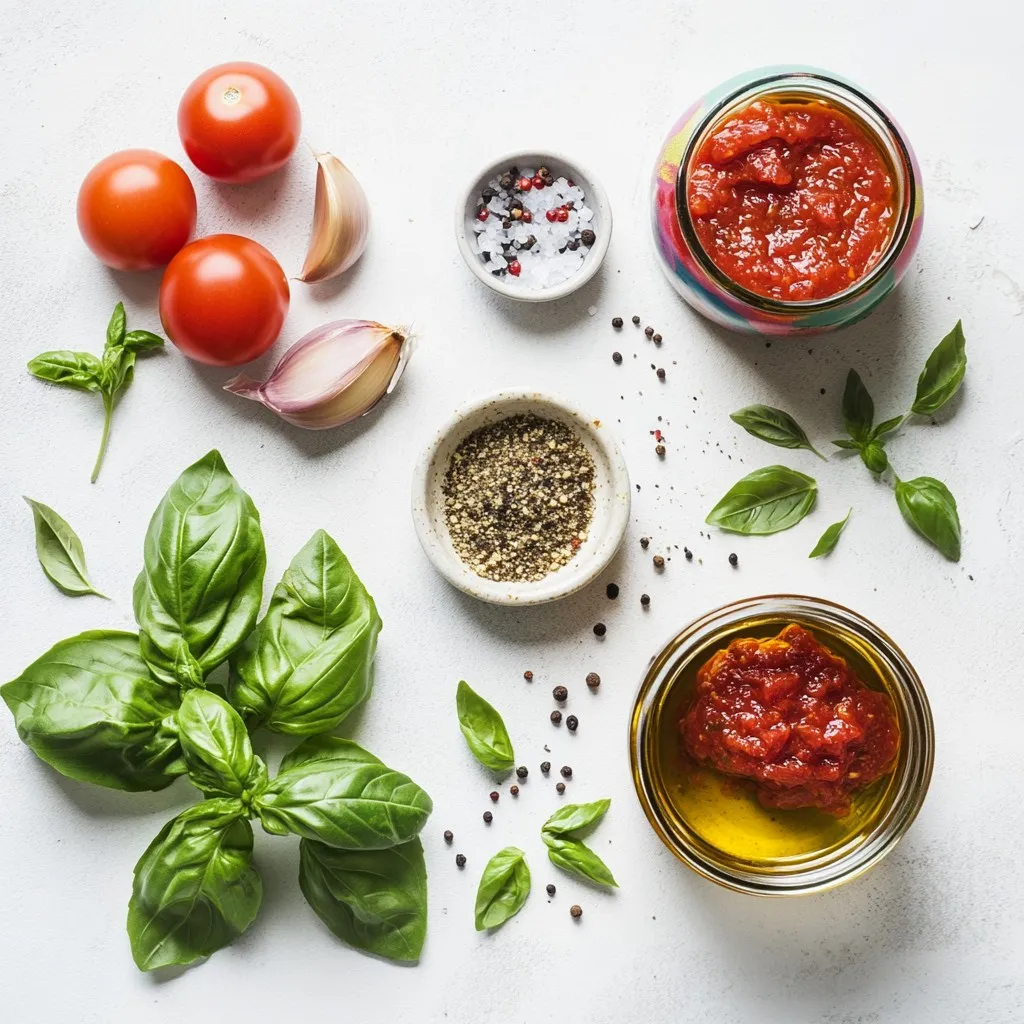 Each ingredient plays a key role. The olive oil gives a smooth base. The onion adds sweetness. Garlic brings a strong aroma. Crushed tomatoes create a chunky texture. Tomato paste deepens the flavor. Sugar balances the acidity of tomatoes. Dried oregano and basil give classic Italian taste. Salt and pepper bring out all the flavors. Finally, fresh basil leaves add color and freshness.