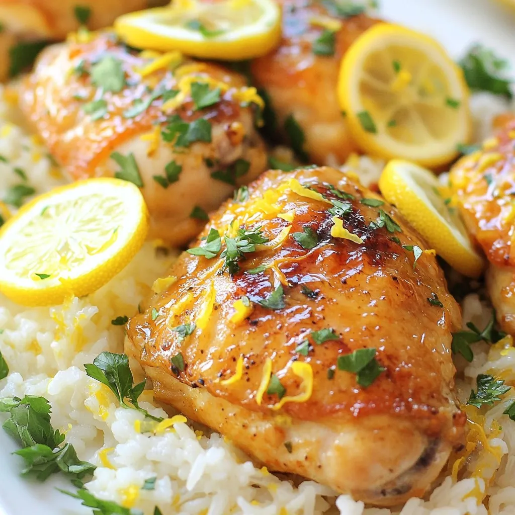 A flavorful dish featuring marinated chicken thighs cooked with rice and aromatic herbs, finished with fresh lemon.