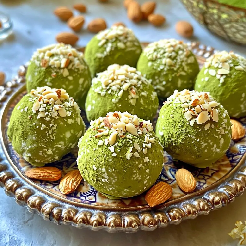 - Presentation Tips: Arrange the truffles on a decorative platter with some whole almonds scattered around, and garnish with a dusting of matcha for an eye-catching display.