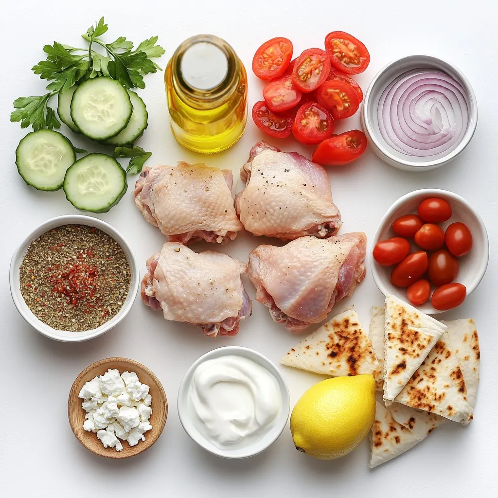 When I make One Pan Chicken Gyros, I start with the main ingredients. The chicken thighs are key. They stay juicy and tender. I mix Greek yogurt, olive oil, and lemon juice in a bowl. This marinade adds flavor and moisture.
