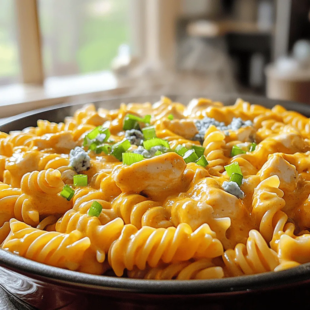 - 2 cups rotini pasta - 1 pound boneless, skinless chicken breasts, diced - 1 tablespoon olive oil - 1 teaspoon garlic powder - 1 teaspoon onion powder - 1/2 teaspoon smoked paprika - Salt and pepper to taste - 1/2 cup buffalo sauce (adjust according to taste) - 2 cups chicken broth - 1 cup heavy cream - 1 cup shredded cheddar cheese - 1/4 cup green onions, chopped (for garnish) - 1/4 cup crumbled blue cheese (optional, for garnish) When I cook this dish, I love how simple the ingredients are. The rotini pasta holds the sauce well. Chicken breasts provide a healthy protein. Olive oil helps to cook the chicken perfectly. The seasonings bring the dish to life. Garlic powder and onion powder add great flavor. Smoked paprika gives a nice touch. You can adjust the salt and pepper to your taste. The buffalo sauce adds a spicy kick. The creamy part comes from heavy cream and cheddar cheese. They make the sauce rich and smooth. Finally, the green onions and blue cheese are optional but add a nice finish. Enjoy this dish, as it satisfies many tastes! To start, heat one tablespoon of olive oil in a large pot over medium heat. Once hot, add one pound of diced chicken breasts. Season the chicken with one teaspoon of garlic powder, one teaspoon of onion powder, and half a teaspoon of smoked paprika. Add salt and pepper to taste. Cook the chicken for about five to seven minutes. You want it browned and cooked through. Next, pour two cups of chicken broth into the pot. Give it a good stir to mix everything. Bring the mixture to a gentle boil. When it starts boiling, add two cups of rotini pasta. Make sure the pasta is fully submerged in the broth. Reduce the heat to a simmer and cover the pot. Cook for 10 to 12 minutes, stirring occasionally to stop it from sticking. Once the pasta is cooked to al dente, lower the heat. Stir in one cup of heavy cream, half a cup of buffalo sauce, and one cup of shredded cheddar cheese. Mix until the cheese melts and the sauce is creamy. Taste the dish and adjust the spice levels if you want it spicier. You can add more buffalo sauce if you like. Let it sit for a couple of minutes to thicken before serving. To keep your pasta from sticking, stir it often. When you add the rotini, make sure it is fully submerged in the broth. This helps it cook evenly and stay loose. For a creamy sauce, use heavy cream and shredded cheddar cheese. The cheese should melt well into the sauce. If you want it creamier, add more cream. Garnish your dish with chopped green onions for a fresh touch. Crumbled blue cheese adds flavor and looks nice too. You can pair this pasta with a simple green salad or garlic bread. Both sides balance the heat of the buffalo sauce. For gluten-free options, swap rotini for gluten-free pasta. Many brands taste great and cook well in this recipe. If you need dairy-free alternatives, use coconut cream instead of heavy cream. Nutritional yeast can replace cheddar cheese for a cheesy flavor without the dairy. {{image_2}} You can switch up the protein in this dish. Turkey works well as a leaner option. Just use the same amount and cook it the same way. If you want a plant-based choice, tofu is great too. Cut it into cubes and cook it until golden. If you love seafood, add shrimp or crab. They cook fast and bring a nice taste. Adjusting spice levels can change the whole dish. If you like it mild, use less buffalo sauce. For more heat, add extra sauce or some red pepper flakes. You can also change the cheeses. Cream cheese gives a rich taste. Pepper jack cheese adds a fun kick. Explore different cheeses to find your favorite blend. Rotini is fun, but feel free to try other pasta shapes. Penne or fusilli are great choices too. They hold the sauce well. If you want a healthier option, use whole grain pasta. It adds fiber and nutrients. Just keep an eye on cooking time, as it may vary. To store leftovers, let the pasta cool down first. Then, put it in an airtight container. Store it in the fridge for up to three days. If you want to freeze it, use a freezer-safe container. This pasta can last in the freezer for about two months. Just remember to label it with the date! When reheating, the best way is to use the stove. Place the pasta in a pan over low heat. Add a splash of chicken broth or cream to keep it creamy. Stir often to heat evenly. To avoid sauce separation, don’t let it boil. Heat it gently until warmed through. This dish lasts about three days in the fridge. If you see any mold or a sour smell, it’s time to toss it. Always check for off colors or changes in texture. If it looks or smells bad, don’t eat it. Better safe than sorry! Yes, you can prep this dish in advance. Cook the pasta and chicken as directed. After cooking, let it cool. Store it in an airtight container in the fridge for up to three days. When ready to eat, reheat it gently on the stove. Add a splash of chicken broth to keep it creamy. This makes for a quick meal on busy days. Absolutely! You can use any pasta you like. Just keep an eye on the cooking time. Thin pastas may cook faster, while thicker ones may need more time. Always check for doneness to get that perfect bite. Rotini holds sauce well, but any pasta will work. This dish pairs well with a simple green salad. A side of garlic bread also complements it nicely. You could serve it with steamed veggies for extra nutrition. For something fun, try dipping celery sticks in blue cheese dressing. These sides enhance the meal and add variety. This recipe shows how to make One-Pot Creamy Buffalo Chicken Pasta. We covered the key ingredients, including rotini, chicken, and creamy sauces. I shared simple steps to prepare, cook, and create a tasty dish. You learned time-saving tips, serving ideas, and options for various diets. Feel free to make it your own with swaps and flavors. Enjoy every bite!