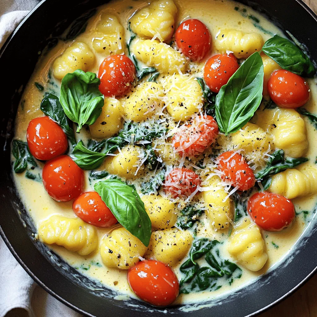 - 1 package (16 oz) potato gnocchi - 2 tablespoons olive oil - 3 cloves garlic, minced - 1 cup cherry tomatoes, halved - 2 cups fresh spinach These main ingredients create a base full of flavor. The potato gnocchi gives the dish its heartiness. Olive oil adds richness, while garlic brings a warm aroma. Cherry tomatoes add sweetness and color. Fresh spinach adds a vibrant green and healthy touch. - 1 cup heavy cream - 1/2 cup grated Parmesan cheese - 1/2 teaspoon Italian seasoning The creamy sauce is key to this dish. Heavy cream makes it rich and smooth. Parmesan cheese adds a salty, nutty flavor. Italian seasoning gives it a classic touch. Together, these ingredients make a sauce that clings to the gnocchi. - Salt and pepper to taste - Fresh basil leaves for garnish Seasoning is vital for taste. Salt enhances flavors, while pepper adds a hint of spice. Fresh basil leaves make a lovely garnish. They add color and fresh aroma. This simple touch elevates the dish's look and taste. - First, heat 2 tablespoons of olive oil in a large skillet over medium heat. - Next, add 3 minced garlic cloves and sauté for about 30 seconds. You want the garlic fragrant, but not burnt. - Add 1 cup of halved cherry tomatoes to the skillet. Cook these for about 3-4 minutes until they soften. You should see them release their juices. - Now, stir in 2 cups of fresh spinach. Cook this until it wilts, which takes about 2-3 minutes. The bright green color will make your dish pop! - While the spinach wilts, cook 1 package (16 oz) of potato gnocchi according to the package instructions. Once done, drain the gnocchi. - Reduce the heat to low and pour in 1 cup of heavy cream into the skillet. Stir well until it’s smooth. - Add the drained gnocchi to the skillet along with 1/2 cup of grated Parmesan cheese and 1/2 teaspoon of Italian seasoning. Toss everything together evenly. - Season with salt and pepper to taste. Let the skillet simmer for 2-3 minutes. This lets the flavors meld together. - Finally, remove the skillet from the heat. Garnish with fresh basil leaves before serving. Enjoy your meal! To make gnocchi just right, start with good quality potato gnocchi. Cook it until it floats in boiling water. This usually takes just a few minutes. Don't overcook them; they should be soft but not mushy. After cooking, drain them well to avoid a watery dish. You can toss them in a little olive oil to keep them from sticking together. This small step makes a big difference! To give the dish a unique twist, try adding fresh herbs. Chopped parsley or thyme can brighten the sauce. You can also use crushed red pepper for a kick. If you like a nutty flavor, consider adding a sprinkle of nutmeg. Each of these options adds depth to your creamy sauce. Don't be afraid to experiment with spices that you love! One Skillet Creamy Tuscan Gnocchi pairs well with a fresh salad. A simple arugula salad dressed with lemon juice complements the rich flavors. You can also serve it alongside grilled chicken or shrimp for protein. Garlic bread makes a great side too. It helps soak up all that delicious sauce! {{image_2}} If you want a vegan version of this dish, you can swap out the cream and cheese. Use coconut milk or cashew cream instead of heavy cream. For cheese, use nutritional yeast or a vegan cheese substitute. These options keep the dish creamy and tasty without dairy. You can add more veggies to this recipe. Consider bell peppers, zucchini, or mushrooms. They add more color and nutrients. Just sauté them along with the garlic and tomatoes. You can also use frozen peas for a quick addition. They cook fast and add a nice sweetness. To make this dish heartier, add protein. Cooked chicken, shrimp, or sausage work well. Just add them after the garlic and tomatoes. If you want a plant-based option, try chickpeas or lentils. They boost protein and keep the meal filling. To store your leftover One Skillet Creamy Tuscan Gnocchi, first let it cool. Place it in an airtight container. This helps keep the flavors fresh. Store it in the fridge for up to three days. When you want to eat it again, remember that the sauce may thicken as it cools. You can add a splash of cream or water to loosen it up. To reheat the dish, use a skillet over low heat. Add a little olive oil or butter to prevent sticking. Stir it gently and add a splash of water or cream. This keeps the dish creamy and prevents it from drying out. Heat until it’s warm. You want to enjoy every bite just as you did first! If you want to freeze this dish, start by letting it cool completely. Portion it into smaller containers for easier thawing. Seal them tightly and label with the date. It can last up to two months in the freezer. To thaw, move it to the fridge overnight. Reheat as mentioned before. Enjoy the creamy goodness even after freezing! Gnocchi is a type of pasta made mainly from potatoes. It can also include flour, eggs, or ricotta cheese. The most common type is potato gnocchi, which is soft and fluffy. When cooked, gnocchi has a light texture and absorbs flavors well. You can find different types of gnocchi, like those made from sweet potatoes or spinach, adding more color and taste. Yes, you can prepare parts of this dish ahead. You can cook the gnocchi and store it in the fridge. Just keep it covered. You can also prepare the sauce in advance and store it separately. When you are ready to eat, reheat the sauce and add the gnocchi. This way, you save time and enjoy a quick meal. You can easily change the flavors to suit your taste. Here are some ideas: - Add proteins: Cooked chicken or shrimp can boost the meal. - Use different veggies: Mushrooms, zucchini, or bell peppers can add variety. - Change the cheese: Try different cheeses like feta or mozzarella for new tastes. - Spice it up: Add red pepper flakes for heat or fresh herbs for freshness. These tweaks can make the dish your own! This article has covered a delicious gnocchi recipe. We explored the main ingredients, c