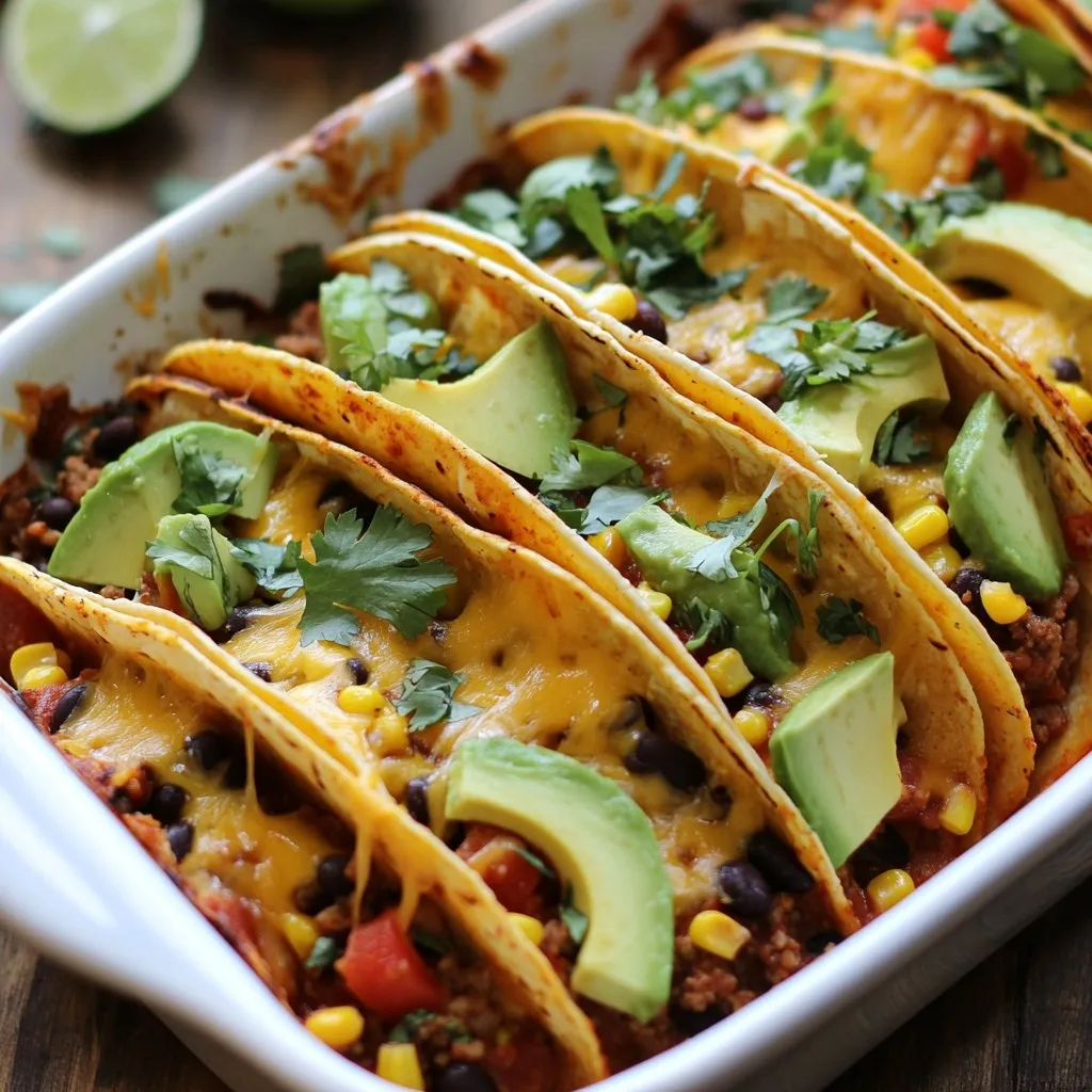 Each ingredient plays a role in creating a tasty dish. The ground beef provides a hearty base. Taco seasoning adds that classic flavor we all love. Black beans and corn give it extra texture and nutrition. The cheese melts beautifully, making every bite creamy. Salsa brings a zesty kick, while avocado and sour cream add freshness. Finally, cilantro and lime brighten up the dish.
