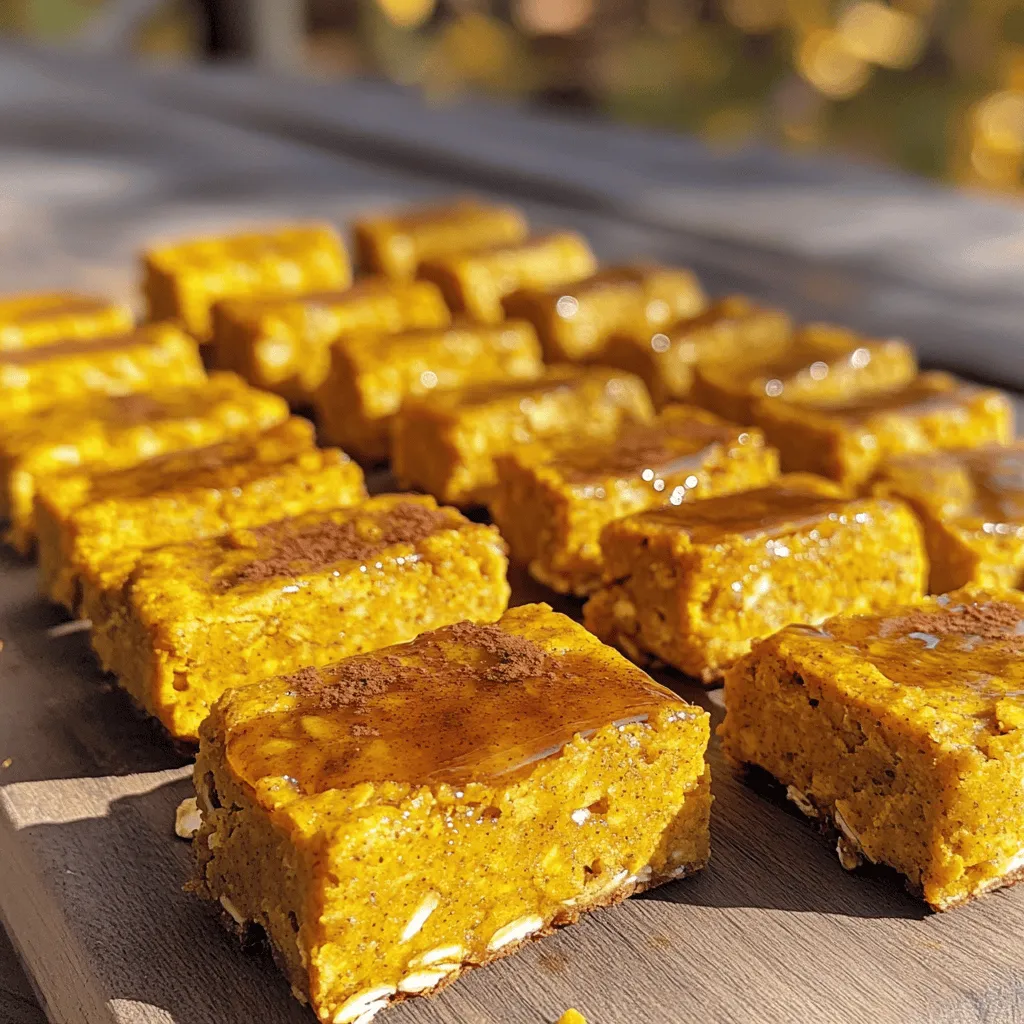 To serve these bars, cut them into squares or rectangles. Arrange them on a rustic wooden board for a cozy look. Drizzle a bit of maple syrup on top for sweetness. Sprinkle some pumpkin spice for flair. This makes them look festive and inviting. You can pair them with a cup of tea or coffee for a perfect snack.