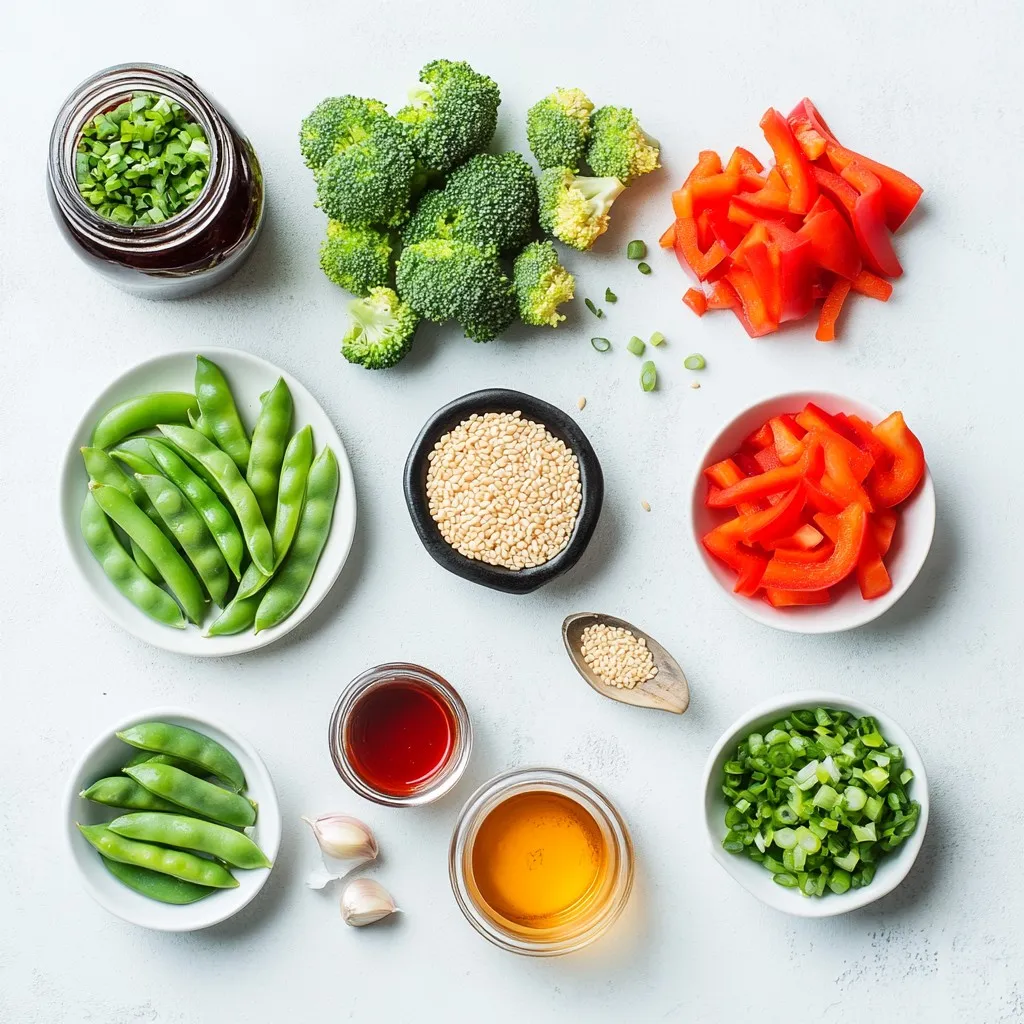 In the same skillet, add a bit more sesame oil if needed. Add minced garlic and grated ginger, sauté for 30 seconds until fragrant. Then add the broccoli, red bell pepper, and snap peas. Stir-fry for another 4-5 minutes until the veggies are tender-crisp.
