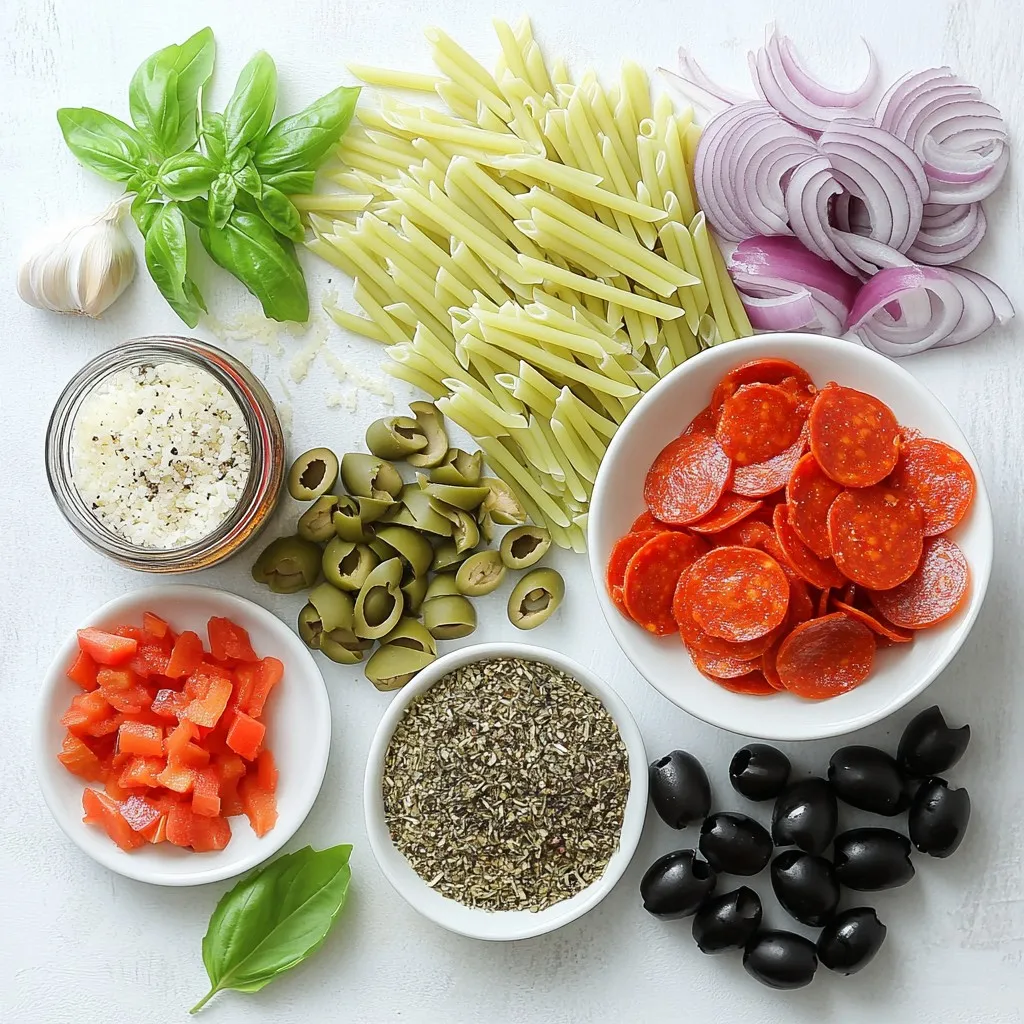 Grab a large mixing bowl. Combine the cooked penne with 1 cup of marinara sauce. Next, add half of the shredded mozzarella cheese. Then, toss in 1 cup of pepperoni slices. Add in ½ cup of diced green bell pepper, ½ cup of sliced black olives, and ¼ cup of diced red onion. For flavor, sprinkle in 1 teaspoon of Italian seasoning and ½ teaspoon of garlic powder. Finish with salt and pepper to taste. Stir everything together until the pasta is coated well.