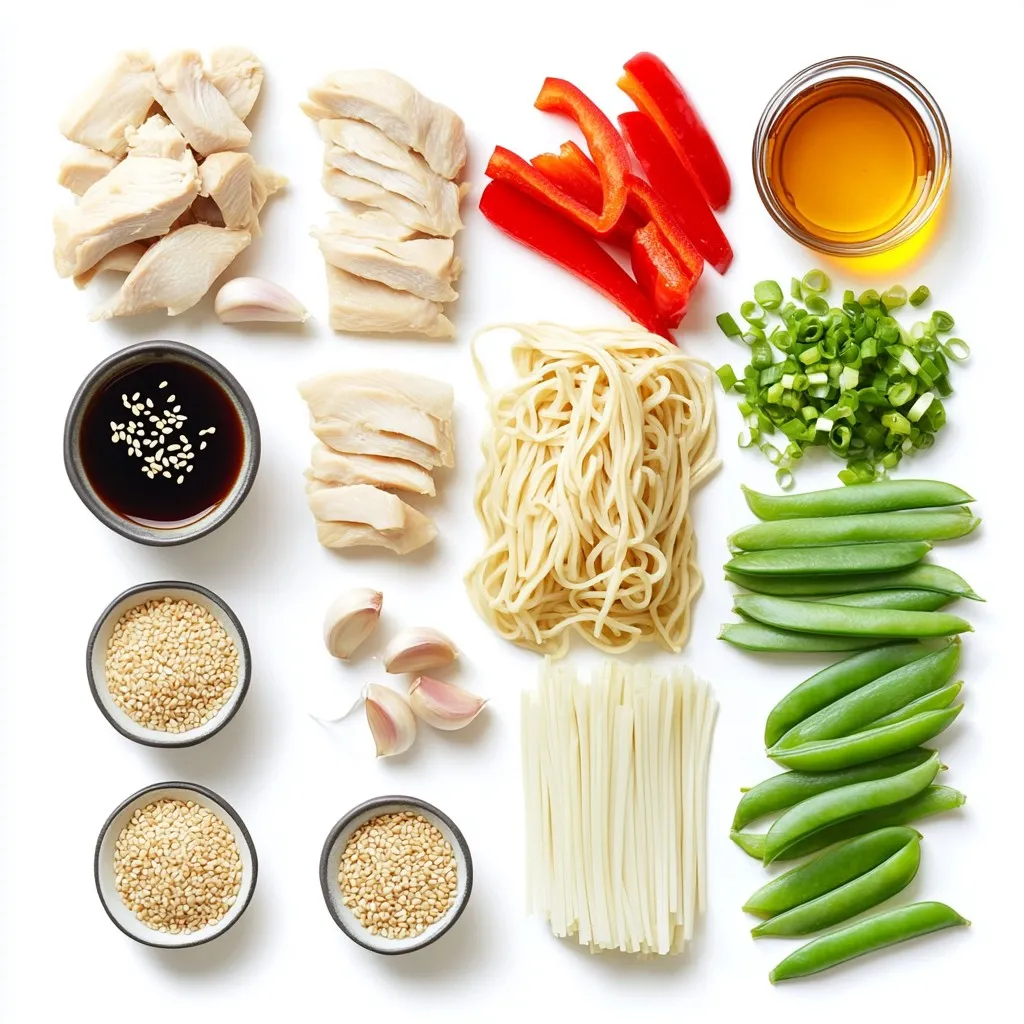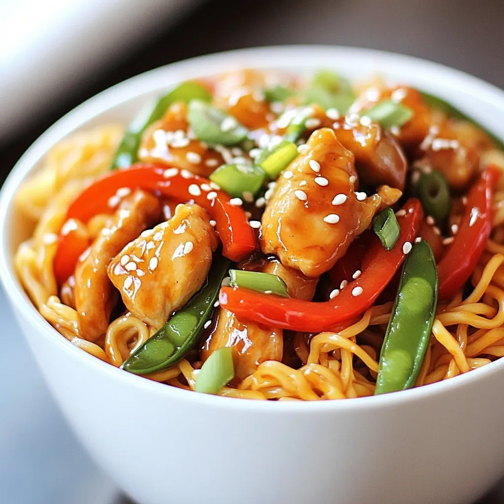 - 300g egg noodles - 2 boneless, skinless chicken breasts, thinly sliced - 4 cloves garlic, minced - 2 tablespoons soy sauce - 2 tablespoons honey - 1 tablespoon sesame oil - 1 tablespoon vegetable oil - 1 red bell pepper, sliced - 1 cup snap peas, trimmed - 2 green onions, chopped (for garnish) - Sesame seeds (for garnish) - Salt and pepper to taste For a perfect meal, I recommend serving four people. Each person gets about 75g of noodles. You can adjust the chicken to 100g per person if you want more protein. For those who are gluten-free, swap the egg noodles for rice noodles. If you're vegetarian, consider using tofu instead of chicken. This recipe is flexible for different tastes and diets. {{ingredient_image_1}} To cook egg noodles perfectly, bring a pot of salted water to a boil. Add the noodles and cook them according to the package instructions, usually about 4-6 minutes. Stir them gently to prevent sticking. Once done, drain the noodles in a colander. Rinse them under cold water to stop the cooking process. This step keeps them from getting mushy. For the chicken, slice two boneless, skinless breasts into thin strips. Season the chicken with salt and pepper. In a large skillet or wok, heat vegetable oil over medium-high heat. Add the chicken to the skillet and cook for about 5-7 minutes. Brown the chicken well. It should look golden and cooked through. Once done, remove it from the skillet and set it aside. Mix soy sauce, honey, and sesame oil in a small bowl. This combination creates a sweet and savory sauce. After you sauté the garlic, pour the sauce over the chicken and vegetables. This timing ensures the sauce mixes well and coats everything perfectly. In the same skillet, add minced garlic and sauté for about 30 seconds. Then, toss in sliced red bell pepper and snap peas. Stir-fry these for about 2-3 minutes until they are tender yet crisp. Return the browned chicken to the skillet, then add the sauce. Finally, add the cooked egg noodles. Toss everything together to combine well. Heat through for another 2-3 minutes. Taste the dish and adjust seasonings if needed. For a beautiful presentation, serve the chicken noodles in deep bowls. Garnish with chopped green onions and a sprinkle of sesame seeds. For extra flair, drizzle a little honey on top for added glossiness. For tender chicken, slice it thinly. This helps it cook fast and stay juicy. Cook it in a hot pan with oil for great browning. Keep an eye on the chicken while it cooks. Remove it from the heat when it’s no longer pink. To avoid overcooked vegetables, add them at the right time. Stir-fry bell peppers and snap peas for just a few minutes. You want them crisp, not mushy. This keeps their bright colors and fresh taste. Want to add heat? Try red pepper flakes or a dash of hot sauce. These spices boost flavor without overwhelming the dish. You can also add ginger for a zesty kick. Feel free to mix in other vegetables. Broccoli, carrots, or bok choy work great. They add color and nutrients, making the dish even better. Serve Sticky Garlic Chicken Noodles with a side salad. A light cucumber salad pairs well. It adds crunch and freshness. For drinks, try iced green tea. Its subtle taste complements the bold flavors of the noodles. Enjoy this meal with friends or family for a fun dinner night! Pro Tips Marinate the Chicken: For enhanced flavor, marinate the sliced chicken in soy sauce and honey for at least 30 minutes before cooking. Use Fresh Ingredients: Fresh garlic and vegetables make a big difference in taste. Opt for fresh snap peas and bell peppers for the best results. Adjust Sauce Consistency: If you prefer a thicker sauce, you can add a cornstarch slurry (cornstarch mixed with water) during the last few minutes of cooking. Garnish for Appeal: Don't skip the garnishes! Chopped green onions and sesame seeds not only add flavor but also enhance the dish's presentation. {{image_2}} For those needing gluten-free options, you can swap egg noodles for rice noodles or zucchini noodles. Both options work great and keep the dish tasty. If you want a vegetarian twist, try using tofu or tempeh instead of chicken. Just stir-fry them until golden brown, then follow the same steps in the recipe. To jazz up your dish, think about adding fresh ginger or a bit of chili paste. These will give your Sticky Garlic Chicken Noodles an exciting kick. If you like crunch, consider tossing in some chopped peanuts or cashews. They add texture and a nice nutty flavor that pairs well with the sauce. If you want to make meals ahead of time, cook everything up to the noodle step. Let it cool, then store in the fridge. You can reheat it later and add fresh noodles. For quick meals, store leftovers in airtight containers. They will last for a few days, so you can enjoy them anytime! To store leftovers of Sticky Garlic Chicken Noodles, let them cool first. Place them in an airtight container. Be sure to seal it tightly to keep moisture out. For best results, divide leftovers into single servings. This makes it easy to grab one when you need it. Glass containers work great, as they don’t stain or smell. You can also use BPA-free plastic containers for a lighter option. To freeze Sticky Garlic Chicken Noodles, use freezer-safe containers. Make sure to leave space for expansion as the food freezes. You can also use freezer bags; just squeeze out the air. To reheat, let them thaw in the fridge overnight. You can heat them in a microwave or a skillet. Add a splash of water or broth to keep them moist while reheating. In the fridge, these noodles last up to three days. If you freeze them, they can stay good for about two months. Check for signs of spoilage before eating. If you see any off-smells or colors, it’s best to toss it out. Always trust your senses; they are your best guide! Yes, you can make this dish ahead of time. Cook the chicken and noodles. Store them in separate containers in the fridge. When ready to eat, heat both and mix the