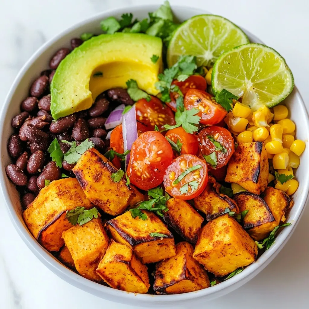 A delicious and healthy taco bowl featuring roasted sweet potatoes, black beans, corn, and fresh toppings.