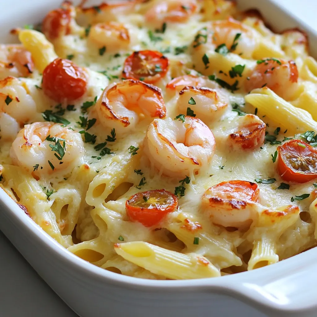 For this Shrimp Scampi Pasta Bake, you will need the following ingredients: - 8 oz penne pasta - 1 lb shrimp, peeled and deveined - 4 cloves garlic, minced - 1 cup cherry tomatoes, halved - 1/2 cup chicken broth - 1/4 cup lemon juice - 1/2 teaspoon red pepper flakes - 1 cup shredded mozzarella cheese - 1/4 cup grated Parmesan cheese - 2 tablespoons olive oil - Salt and pepper to taste - Fresh parsley, chopped (for garnish) To make this dish even better, consider these optional ingredients: - A splash of white wine for depth - Fresh basil or oregano for extra herbs - A squeeze of lime juice for zest - Sliced black olives for a salty bite These options can enhance the flavor and make your meal unique. Feel free to mix and match! If you don’t have some of these ingredients, here are some swaps you can use: - Penne Pasta: Use any small pasta shape like rotini or fusilli. - Shrimp: Substitute with cooked chicken or tofu for a different protein. - Chicken Broth: Vegetable broth works well for a lighter flavor. - Mozzarella Cheese: Try a different cheese, like cheddar or gouda, for a new taste. These substitutions keep the dish delicious while using what you have on hand. Adjust recipes to fit your pantry and taste! {{ingredient_image_1}} First, gather all your ingredients. You will need: - 8 oz penne pasta - 1 lb shrimp, peeled and deveined - 4 cloves garlic, minced - 1 cup cherry tomatoes, halved - 1/2 cup chicken broth - 1/4 cup lemon juice - 1/2 teaspoon red pepper flakes - 1 cup shredded mozzarella cheese - 1/4 cup grated Parmesan cheese - 2 tablespoons olive oil - Salt and pepper to taste - Fresh parsley, chopped (for garnish) Next, preheat your oven to 375°F (190°C). This step makes sure your dish bakes evenly later. Cook the penne pasta as the package says until it is al dente. Drain it and set it aside. Now, heat the olive oil in a large skillet over medium heat. Add the minced garlic and sauté it for about one minute. You want it to smell nice. Then, add the shrimp to the skillet. Cook the shrimp for 3 to 4 minutes until they turn pink and opaque. This means they are cooked. After that, stir in the halved cherry tomatoes, chicken broth, lemon juice, and red pepper flakes. Cook this mixture for another 2 minutes. Letting it cook lets the flavors mix well. In a large bowl, mix the cooked pasta with the shrimp mixture. Add salt and pepper to your taste. Make sure you mix it well so every bite is tasty. Transfer the pasta and shrimp mixture into a greased 9x13 inch baking dish. Spread it out evenly. Now, sprinkle the mozzarella and Parmesan cheese on top. This will melt and create a lovely cheesy layer. Put the dish in the preheated oven. Bake it for 20 to 25 minutes. You want the cheese to be bubbly and golden brown. Once it’s done, take it out of the oven and let it cool for a few minutes. Before serving, garnish with freshly chopped parsley. This adds a lovely touch and a pop of color. To cook shrimp just right, start with fresh or frozen shrimp. If using frozen, let them thaw first. Heat olive oil in your skillet. Add minced garlic and sauté for about one minute. Then, add the shrimp. Cook them for three to four minutes until they turn pink. This shows they are done. Overcooking can make shrimp tough. Always keep an eye on them. When cooking pasta, follow package instructions for timing. For penne, aim for al dente, which means firm to the bite. This helps the pasta hold its shape in the bake. Use plenty of water and add salt. This adds flavor to the pasta. Once cooked, drain the pasta and toss it with a little olive oil to prevent sticking. Serve your Shrimp Scampi Pasta Bake with a fresh salad. A simple green salad works well. You can also add crusty garlic bread for a delightful crunch. For drinks, try a chilled white wine or sparkling water with lemon. Both pair nicely with the dish's rich flavors. Garnish with chopped parsley for a fresh touch. This adds color and brightens the dish. Pro Tips Use Fresh Shrimp: For the best flavor and texture, opt for fresh shrimp instead of frozen. If using frozen, ensure they are completely thawed before cooking. Don’t Overcook the Pasta: Cook the penne pasta just until al dente, as it will continue to cook in the oven. This prevents the pasta from becoming mushy. Adjust the Spice Level: If you prefer a milder dish, reduce the amount of red pepper flakes or omit them entirely. For more heat, feel free to add extra! Garnish for Freshness: Always garnish the dish with fresh parsley just before serving to add a burst of color and freshness to the baked pasta. {{image_2}} You can easily make this dish vegetarian or vegan. Instead of shrimp, use mushrooms or eggplant. Both add great texture and soak up flavors well. For a vegan twist, swap chicken broth with vegetable broth. Also, replace cheese with a plant-based version. Nutritional yeast can add a cheesy taste without dairy. While penne works great, you can use any pasta you like. Shells, fusilli, or even spaghetti can fit well. Just make sure to adjust cooking time based on the pasta type. You want it to be al dente before baking. This helps keep it firm and tasty when mixed with the sauce. Herbs and spices can change the whole dish. Fresh basil or thyme adds lovely notes. If you want more heat, try adding cayenne pepper. For a zesty kick, mix in lemon zest or more lemon juice. You can also include capers for a salty burst. This dish is flexible. Feel free to experiment with flavors you love! To store leftovers, let the dish cool down first. Then, place it in an airtight container. This helps keep the shrimp scampi pasta bake fresh. You can store it in the fridge for up to three days. If you want to enjoy it later, freezing is a great option. To reheat shrimp scampi pasta bake, preheat your oven to 350°F (175°C). Place the leftover pasta bake in an oven-safe dish. Cover it with foil to keep it moist. Heat for about 15-20 minutes or until hot. You can also microwave it. Use a microwave
