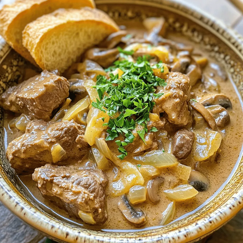 Serve your beef stroganoff in shallow bowls. This makes it look nice and allows for easy eating. For a full meal, add a side of crusty bread. It’s perfect for dipping into the rich sauce. A sprinkle of fresh parsley adds color and freshness. This simple touch makes your dish pop!