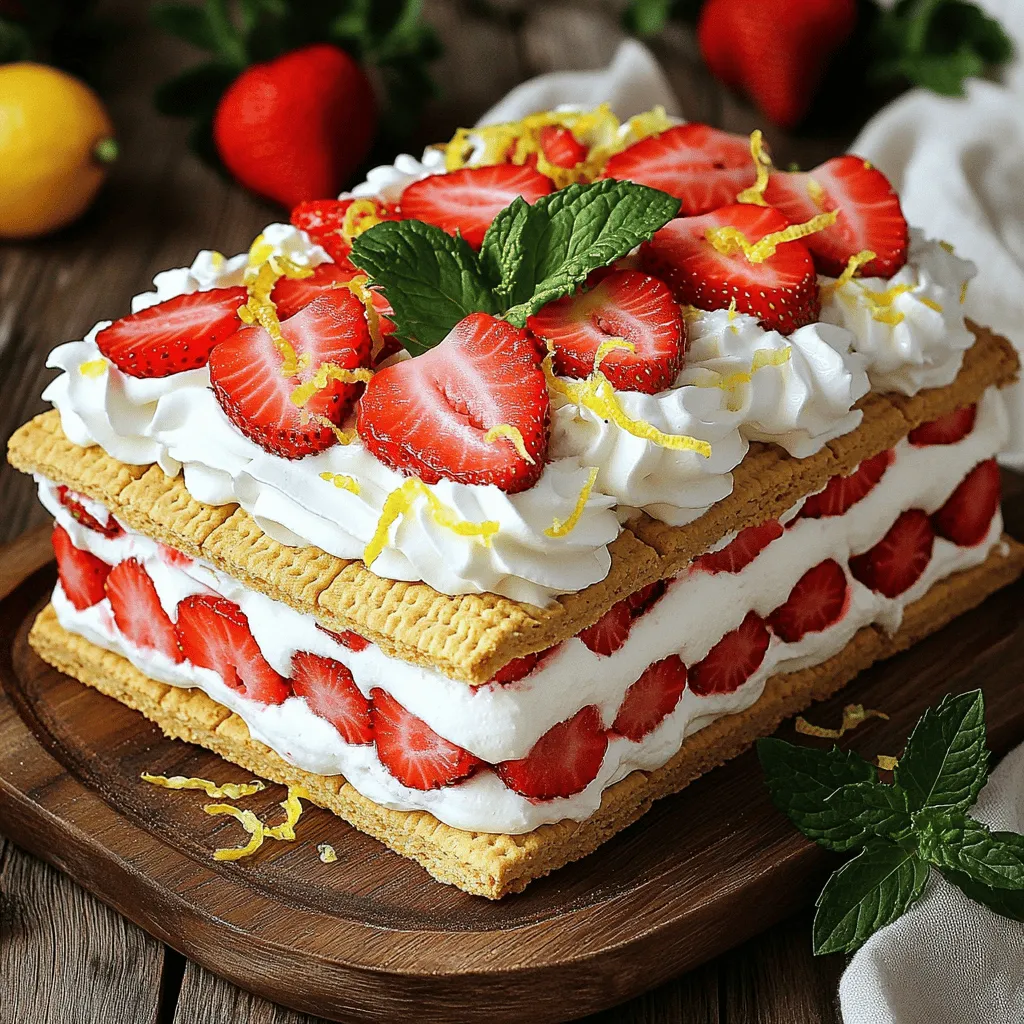 Layering is key to a great icebox cake. Start with a flat layer of graham crackers. Use enough cream to cover the crackers fully. Spread the cream evenly for a nice look. When adding strawberries, make sure to include their juices. This adds flavor and moisture to the cake. Repeat the layers until you reach the top. Finish with whipped cream and strawberries for a beautiful look.