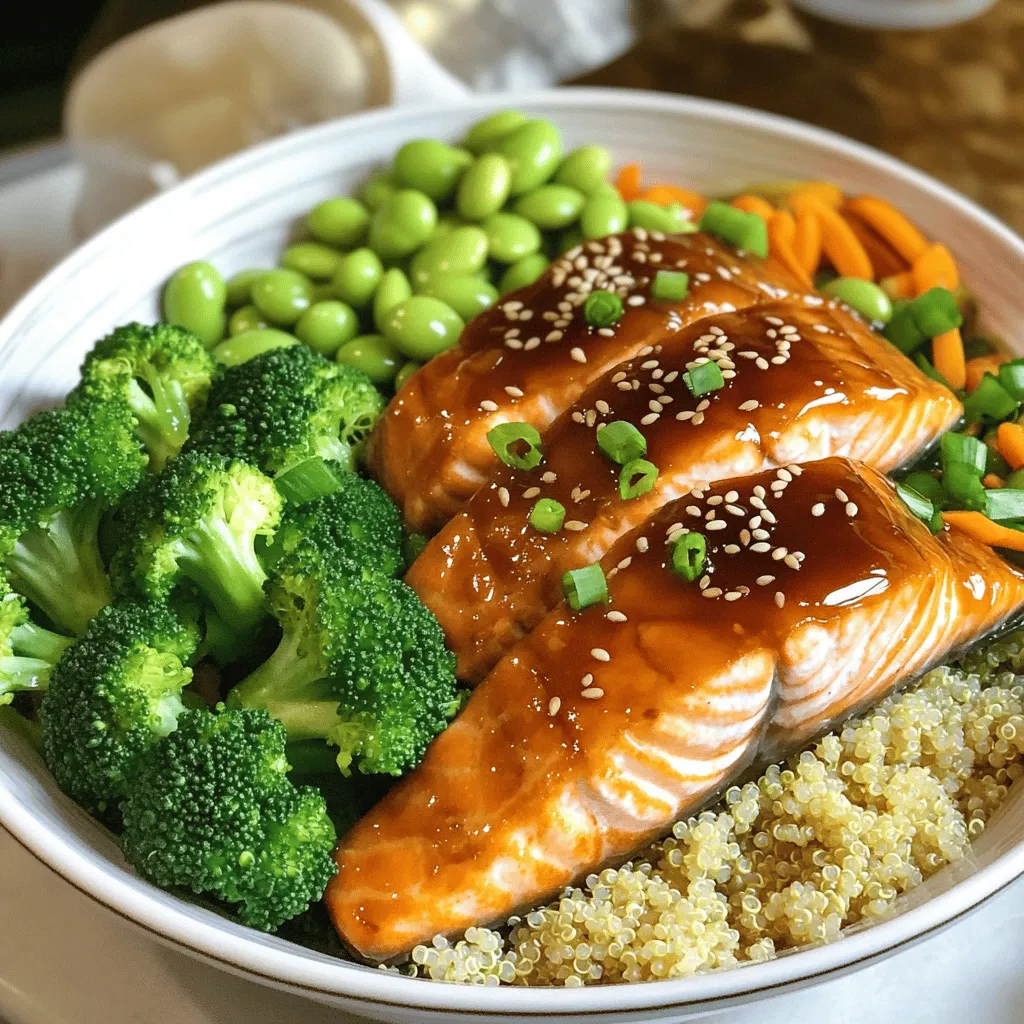 In each bowl, place a scoop of quinoa as the base. Layer in the steamed broccoli, sautéed carrots, and edamame. Finally, add a piece of the teriyaki-glazed salmon on top. Drizzle any extra teriyaki sauce over each bowl for extra flavor.