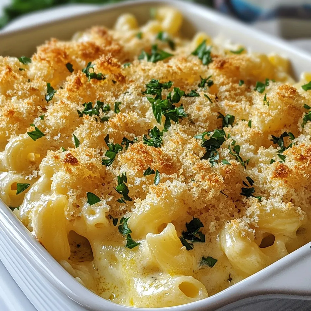 A rich and creamy baked macaroni and cheese dish topped with crispy Panko breadcrumbs.