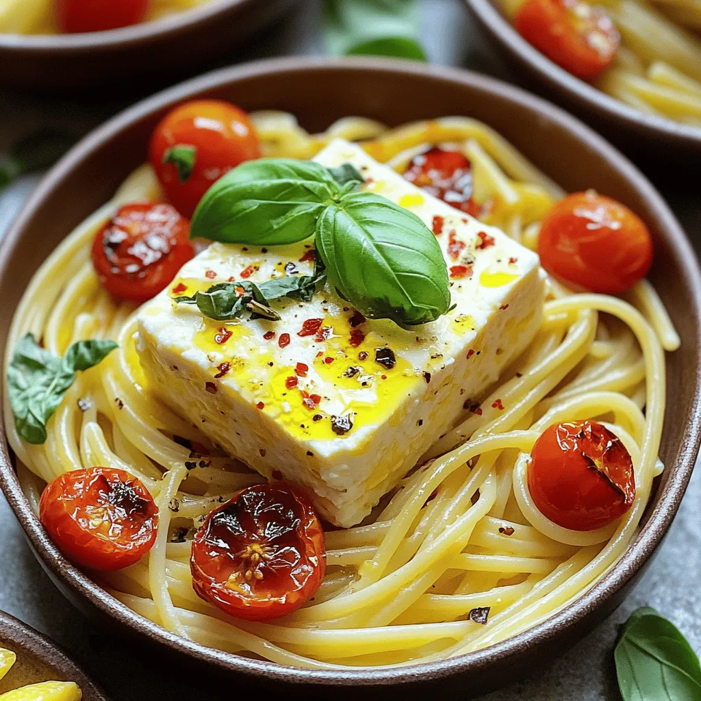 - 1 block (8oz) feta cheese - 2 cups cherry tomatoes, halved - 3 cloves garlic, minced - 1/4 cup extra virgin olive oil - 1 teaspoon dried oregano - 1/2 teaspoon red pepper flakes (adjust to taste) - 12 oz pasta (penne or fusilli) - Fresh basil leaves for garnish - Zest of 1 lemon In this recipe, the main ingredients are simple yet packed with flavor. Feta cheese is the star of the dish. It melts beautifully, adding creaminess to the pasta. Cherry tomatoes add sweetness and a pop of color. Minced garlic gives a wonderful aroma and taste. The additional ingredients enhance the dish. Extra virgin olive oil adds richness, while oregano and red pepper flakes bring warmth and depth. You can adjust the red pepper flakes to match your spice level. For the pasta, I recommend penne or fusilli. These shapes hold the sauce well, making each bite enjoyable. Fresh basil leaves and lemon zest brighten the dish and add a fresh finish. As you gather these ingredients, think about how they come together. Each brings its unique taste, creating a delightful meal that everyone will love. 1. Preheat the oven to 400°F (200°C). This helps the feta and tomatoes cook perfectly. 2. Prepare the baking dish. In a 9x13 inch dish, place the block of feta cheese in the center. Surround it with the halved cherry tomatoes and minced garlic. This mixture is key to the dish's flavor. 1. Season the mixture. Drizzle the extra virgin olive oil over the feta and tomatoes. 2. Sprinkle the spices. Add dried oregano, red pepper flakes, salt, and pepper on top. This adds depth to the dish. 3. Bake the dish. Place it in the oven and bake for 25-30 minutes. You want the feta to soften and turn golden, while the tomatoes blister. This creates a rich, creamy sauce. 1. Cook the pasta. Follow the package instructions until it is al dente. Make sure to reserve 1 cup of pasta water before draining. 2. Combine the baked ingredients. Once the feta and tomatoes are done, remove the dish from the oven. Use a fork to mash the feta with the tomatoes, garlic, and olive oil until creamy. 3. Mix with pasta. Add the drained pasta to the dish, mixing well. Slowly add reserved pasta water until the sauce reaches your desired consistency. Adjust the seasoning if needed. This step is important to ensure every bite is flavorful. To make your dish shine, spice levels matter. I love using red pepper flakes. Start with 1/2 teaspoon. You can add more if you want more heat. Taste as you go. This method keeps your dish tasty yet balanced. Pasta texture is key. Aim for al dente pasta, which means it still has a slight bite. When cooking, follow the package instructions carefully. Always save some pasta water before draining. This water helps make the sauce creamy and smooth. Garnishing makes a big difference! Fresh basil leaves add color and flavor. Just sprinkle them on top. Lemon zest brings a bright touch. Use a microplane to finely grate the zest before adding. For serving, use deep bowls. This helps keep the sauce contained. Drizzle a little olive oil on top for richness. If you like cheese, add freshly grated parmesan for extra flavor. Your dish will look and taste amazing! {{image_2}} You can change this dish to fit your taste. Using different types of cheese can add new flavors. For example, goat cheese works well. It has a tangy taste that pairs nicely with tomatoes. You might also try mixing in some mozzarella for a creamier texture. Adding vegetables can really enhance this dish. Spinach is a great choice. It cooks down and blends well with the sauce. Bell peppers add a nice crunch and sweetness. Feel free to toss in other veggies like zucchini or mushrooms for extra color and nutrition. If you need gluten-free options, you can use gluten-free pasta. Many brands offer good choices that taste great. Look for pasta made from rice or lentils for a healthy twist. For those who follow a vegan diet, there are cheese alternatives available. Many brands make vegan feta that can work well in this recipe. You can also use cashew cheese for a creamy texture. Just keep in mind that the flavor may change slightly, but it can still be delicious! After you finish this tasty dish, store any leftovers in airtight containers. This helps keep the flavors fresh. Make sure to let the pasta cool down before sealing the container. The pasta will last in the fridge for about three to five days. If you want to enjoy it later, just reheat it. You can freeze this baked pasta for up to three months. To freeze, let it cool and then transfer it into freezer-safe containers. Be sure to label them with the date. When you are ready to eat, thaw it overnight in the fridge. Reheat in the oven at 350°F (175°C) until hot, about 20-25 minutes. You can also reheat it in the microwave, but this may change the texture a bit. Add a splash of water to keep it moist. To make the sauce creamy, you can adjust the pasta water. After cooking your pasta, save about one cup of the water. When you mix the baked feta and tomatoes with your pasta, add the reserved pasta water slowly. Stir well and check the creaminess. If it’s too thick, add more water a bit at a time until you get the smooth texture you want. This helps keep the sauce light and flavorful without making it too watery. Yes, you can use frozen tomatoes. They will change the texture a bit. Frozen tomatoes often become softer when cooked. This can be nice for creating a sauce, but it may lack the fresh taste of ripe tomatoes. If you use frozen, let them thaw and drain some liquid before baking. This helps avoid excess water in your pasta dish. This pasta dish goes well with simple sides. A fresh salad with greens, like arugula or spinach, adds a nice crunch. You could also serve crusty bread on the side. The bread is great for mopping up the creamy sauce. For a heartier option, try garlic bread or a light soup. These choices will complement the rich flavors of the pasta nicely. This blog post covered a delightful baked feta tomato 