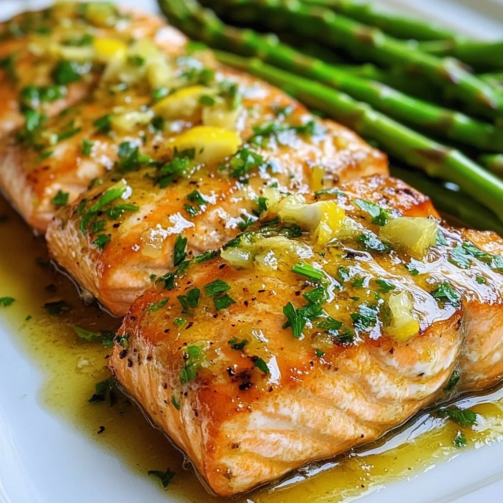 Serve the salmon on a bed of steamed asparagus or a fresh salad, drizzling any remaining lemon garlic sauce from the baking sheet over the top for added flavor.